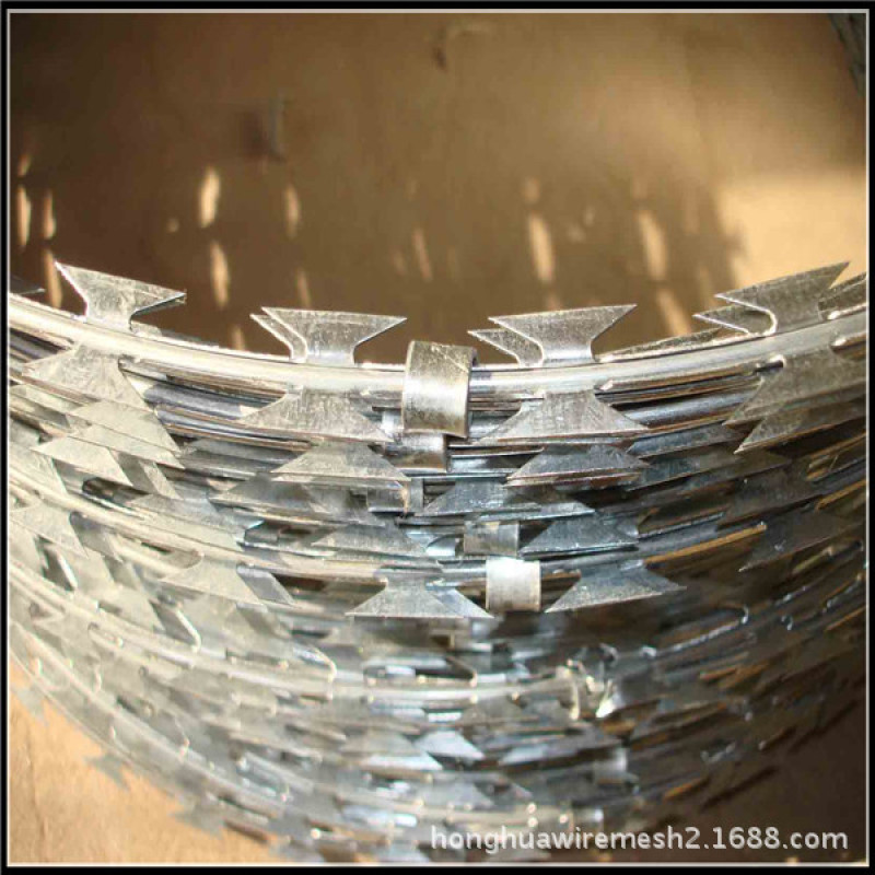 刀片网编制及特点:刀片刺绳是由锐利尖角的钢丝,以及高张力钢丝做线芯组合成的阻绝材料。由于刺线网造型独特不易触摸,因而能达到极好的防护效果。