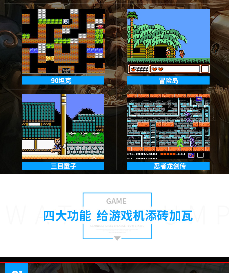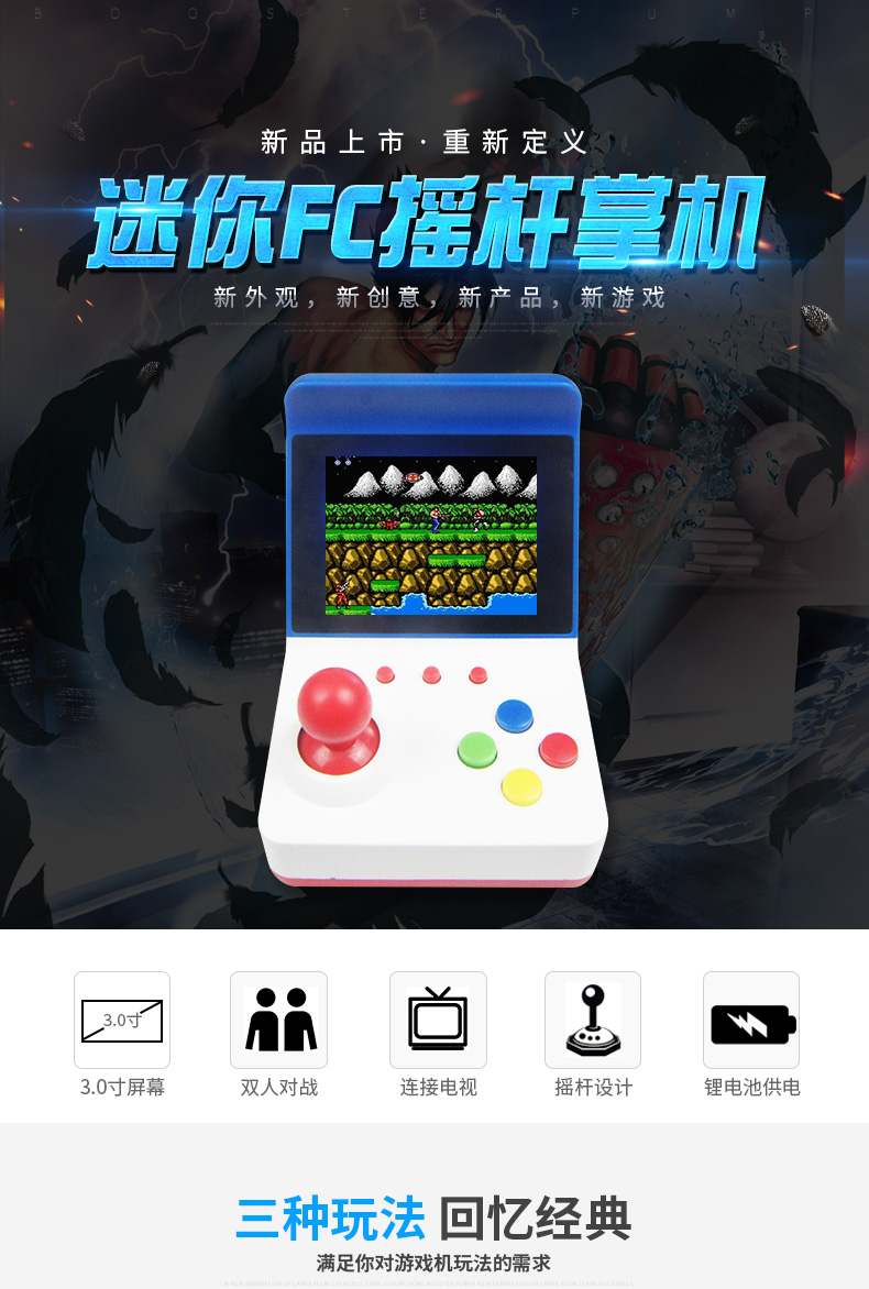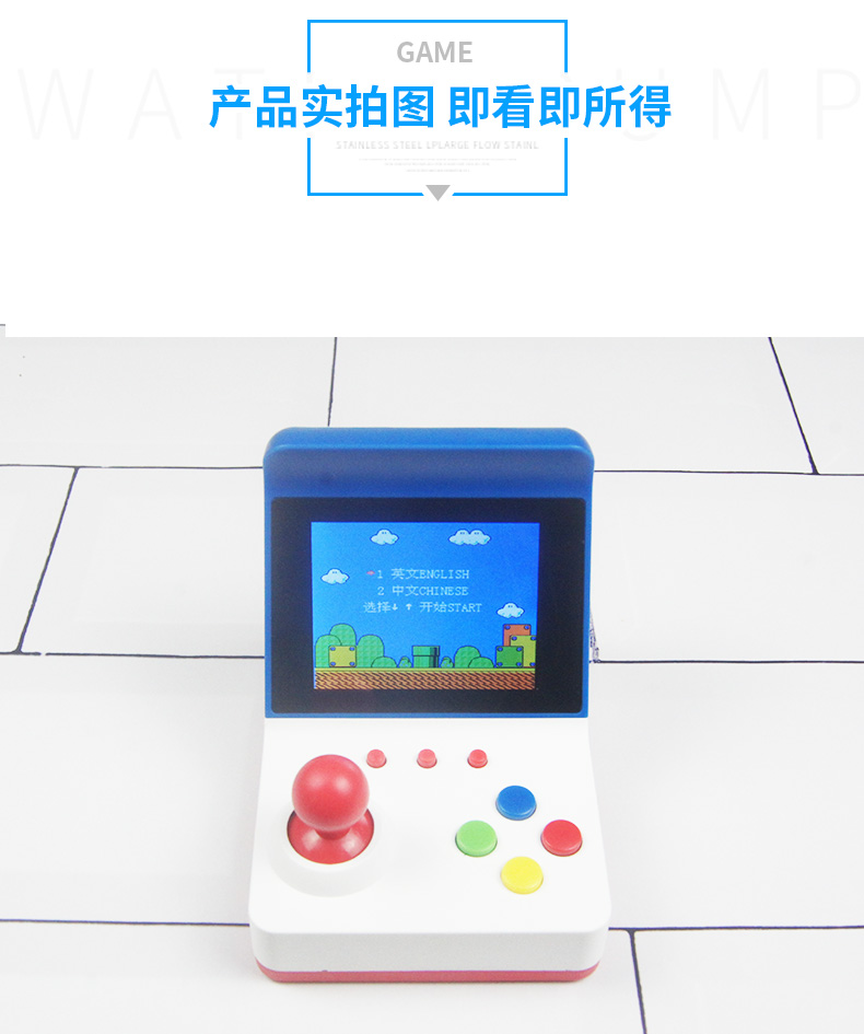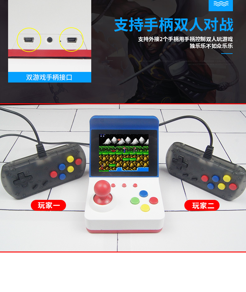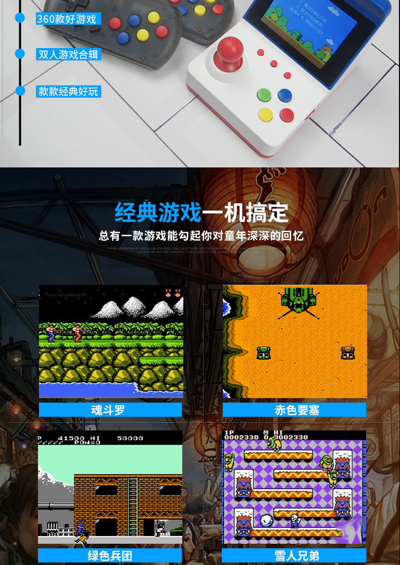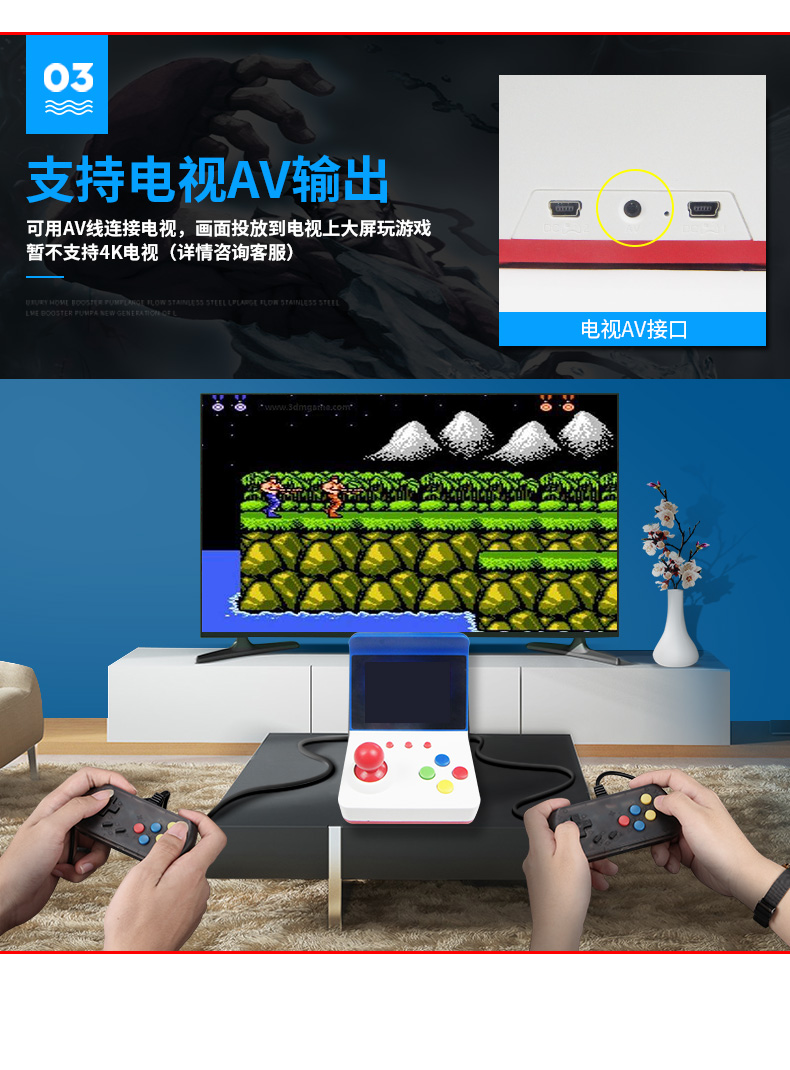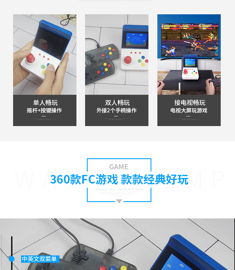 标配:主机*1、包装盒*1、充电线*1、AV线*1、说明书*1(可配手柄,1个加6元)