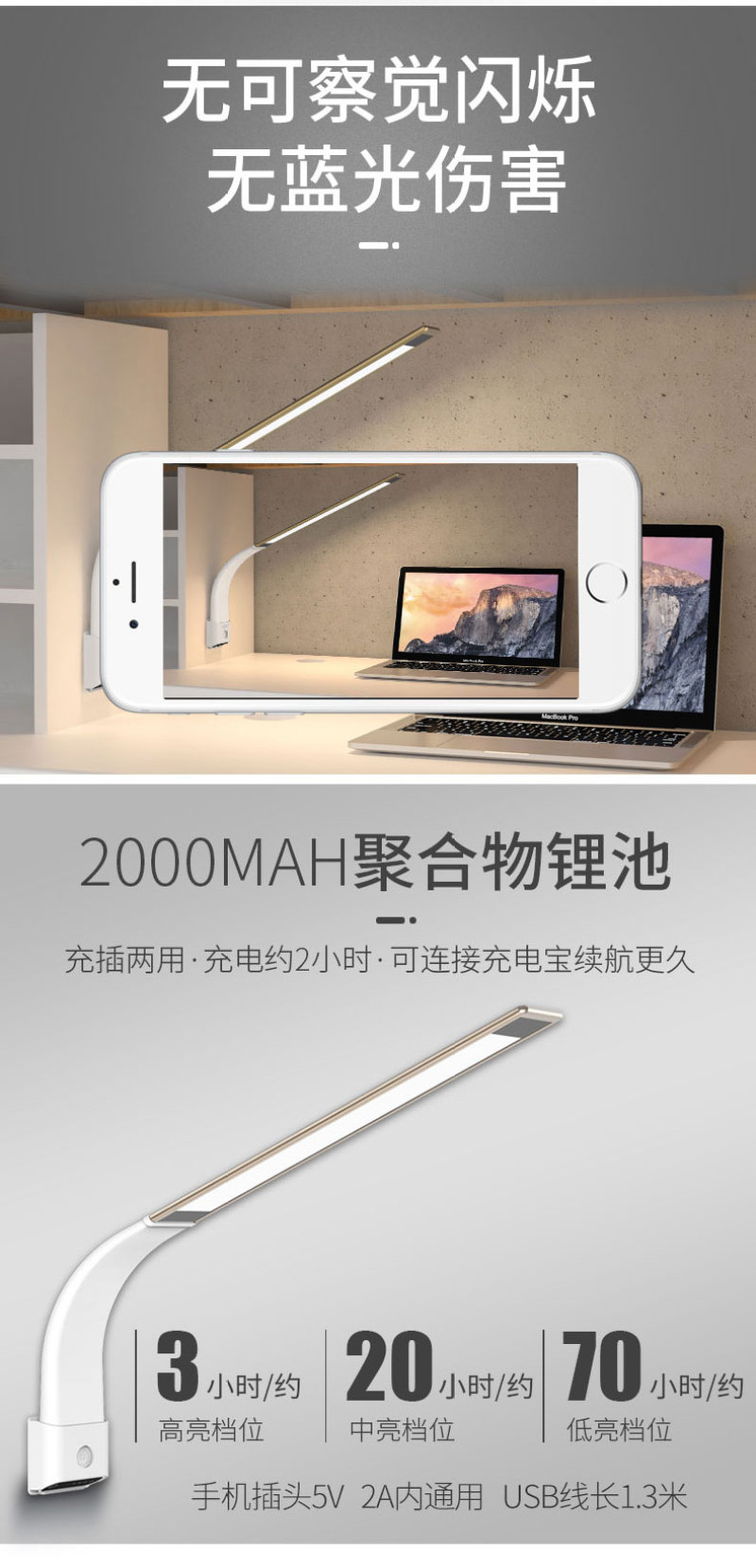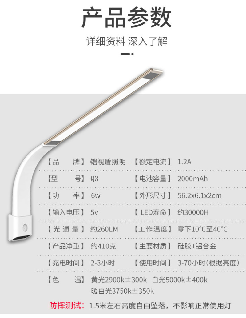 Material: aluminum alloy + silica gel + nylon battery capacity: 2000mAh battery type: polymer battery (grade A) color temperature: yellow 3100K (suitable for screen lighting)/warm white 4200K (suitable for reading)/white 5400K (suitable for writing)