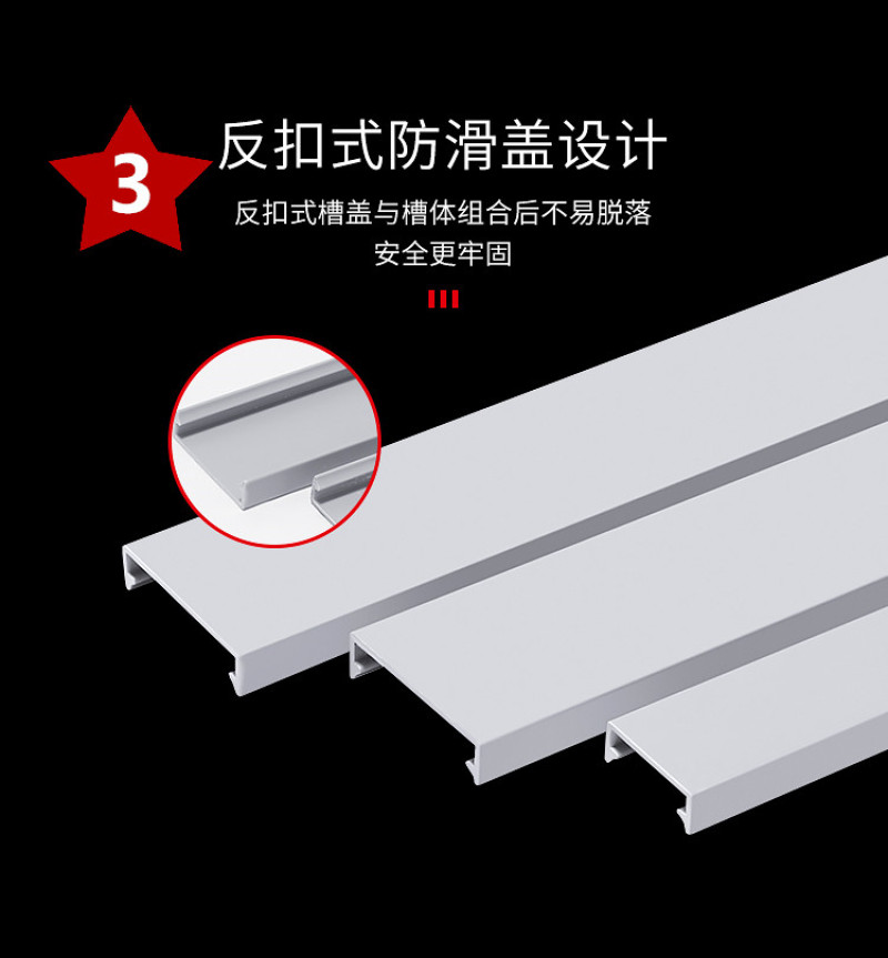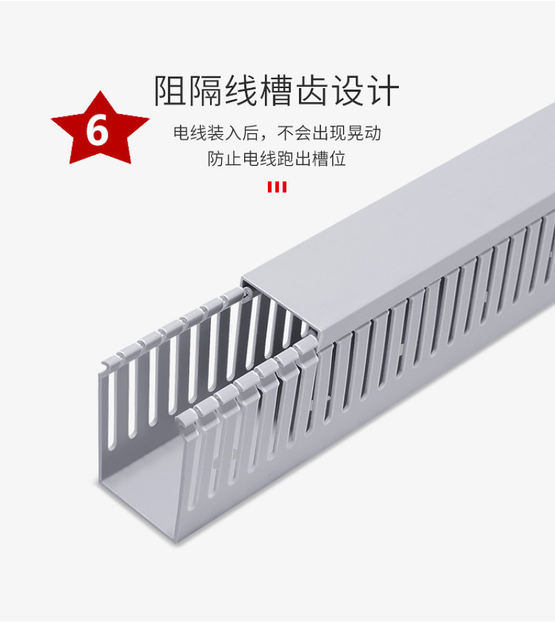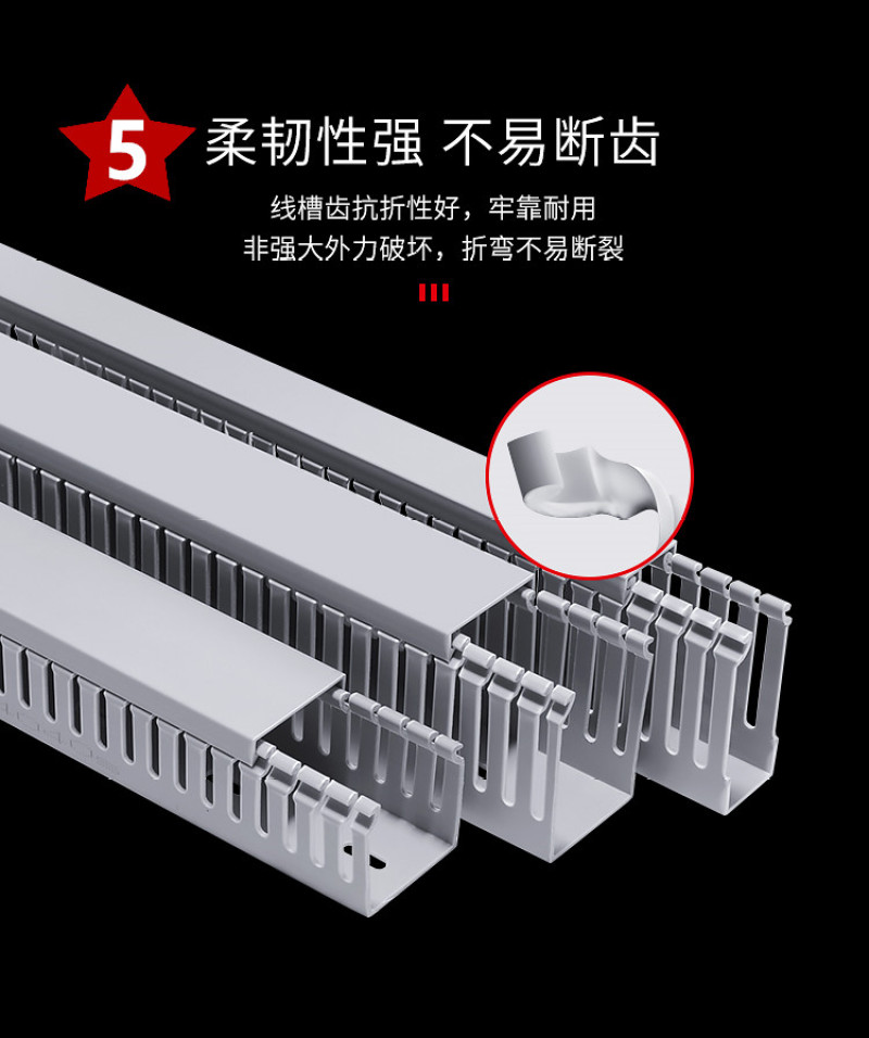 采用PVC料制造而成,线槽齿抗折性好,结合面平滑,配线槽内90度不易断裂。氧指数大于40,在遇火的情况下,能阻止火势的蔓延,延长保护线路的时间。工作温度可以在-25度持续高温至75度.。具有绝缘、防弧、等特点,让你用得放心。