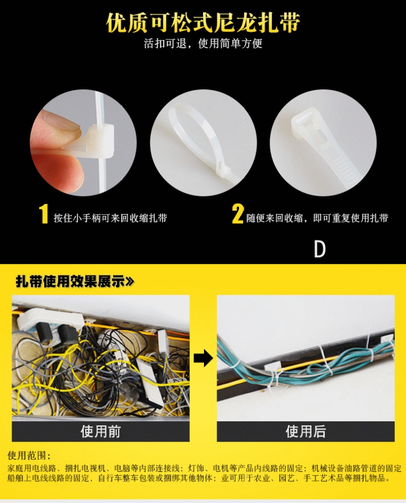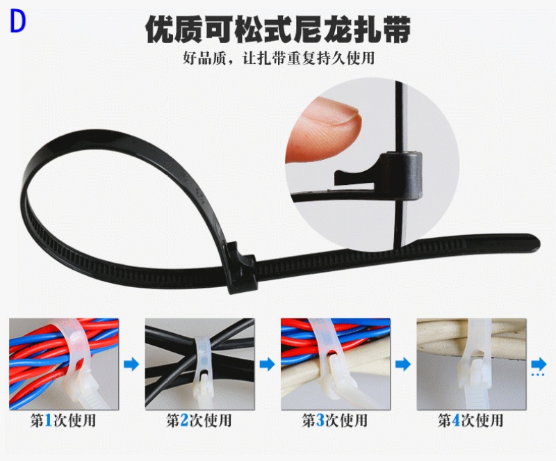 3.无论是绳索仍是传统扎线,在实际操纵当中都比较麻烦,工人操纵的尺度也难同一,人工本钱较高。而自锁式的尼龙扎带的使用却相对简朴,而且尺度同一的便用方法,为企业带来较高的效力。