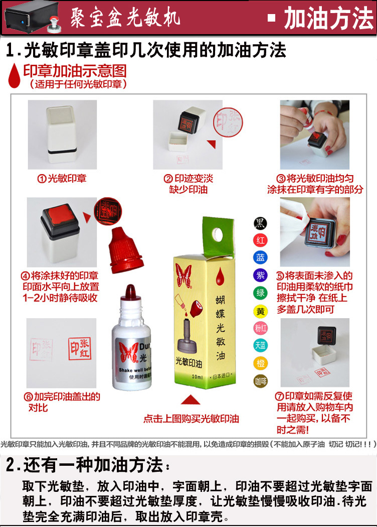 The butterfly brand photocopy ink sold by our store is imported from Japan (produced by the company that invented the photocopy stamp). It has very strong penetration (it dries after one print and can be wiped directly with the hand, never dissolves). Do not add oil to the oil-filling port of the photocopy stamp that is not an upgraded product. The reason is that most of the shells of the photocopy stamps sold in the market are domestic products. In addition, the plastic shell of the shell cannot accept the imported ink, which will lead to the shell becoming brittle, cracking, and hardening. Therefore, you can add oil from the surface of the word, and the effect is the best!