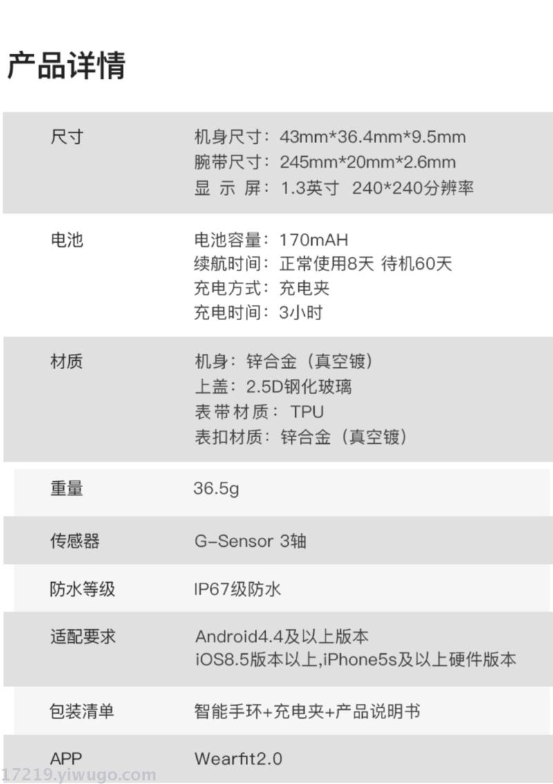 Software features: Time display, step counting, calorie, distance, sports modes, raise hand to light screen, sleep monitoring, running track, call reminders, message reminders, long sitting reminders, alarm reminders, do not disturb mode, shake to take photos, find the bracelet, watch face switch, watch face English, whole point measurement, WeChat movement, heart rate, blood pressure, blood oxygen, Apple Health, health weekly report, Bluetooth name, language, OTA upgrade, and so on.