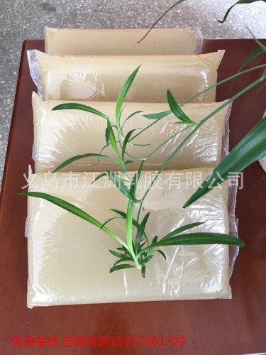 I. Main ingredients: Jelly Glue (animal protein glue, gel) is mainly made of leather glue and gelatin as main materials and modified by adding additives such as water. The transparent solid glue is jelly-shaped. II. Features and uses: the appearance of this product is light yellow, transparent and free of impurities, the smell is fragrant, non-toxic and harmless, and it is an environment-friendly adhesive. Jelly Glue has a wide range of use, good initial stickiness and long opening time. This product is suitable for folders, notebooks, wine box, underwear box, gift boxes, photo albums, etc. 3. Instructions for use: This product is suitable for leather shell machine (straight line machine) and full-automatic lid machine. When using it, you must turn on the temperature of the glue machine to 80-85°C. The glue block should be fully dissolved and add appropriate amount of clean water, the viscosity of the glue can be adjusted according to the thickness of the paper, which does not hurt the skin and corrode the equipment. Clean water can be. 4. Storage and packaging: This series of products must be stored in a cool and dry room to avoid high temperature and sun exposure. Specification: 25Kg package, shelf life is 12 months.