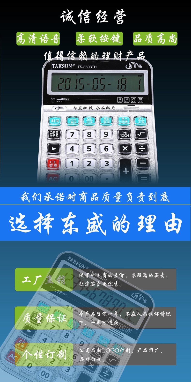 Yiwu City Billiton tide of electronic business firm is a professional production and processing company that specializes in the production and processing of stationery cash registers, financial dimension, Chuan Wei Kang Yi number, DUPLO Calculator, KENKO CITYCAL, XINNOU, CASIO SHAP, KADIO stationery products, and has a complete scientific quality management system.Yiwu City Billiton tide of electronic commerce business integrity strength and quality of products recognized by the industry Welcome friends from all walks of life to come to visit guidance and business negotiation