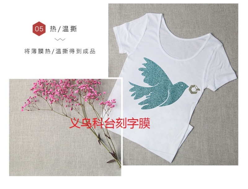 5: product production is simple, arbitrary and strong, easy to take pictures, design patterns can be cut through cutting plotter, and then use a hot transfer machine. You can also cut patterns manually, using household iron for heat transfer, very simple operation.