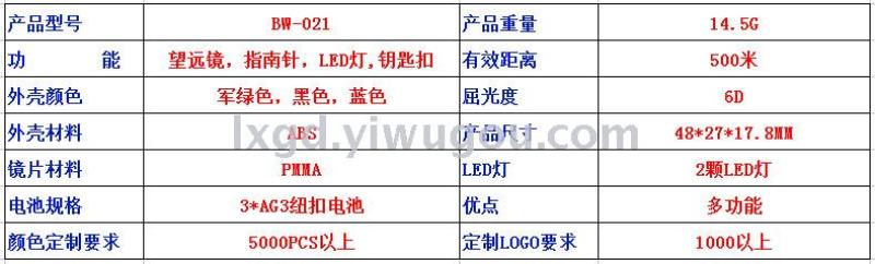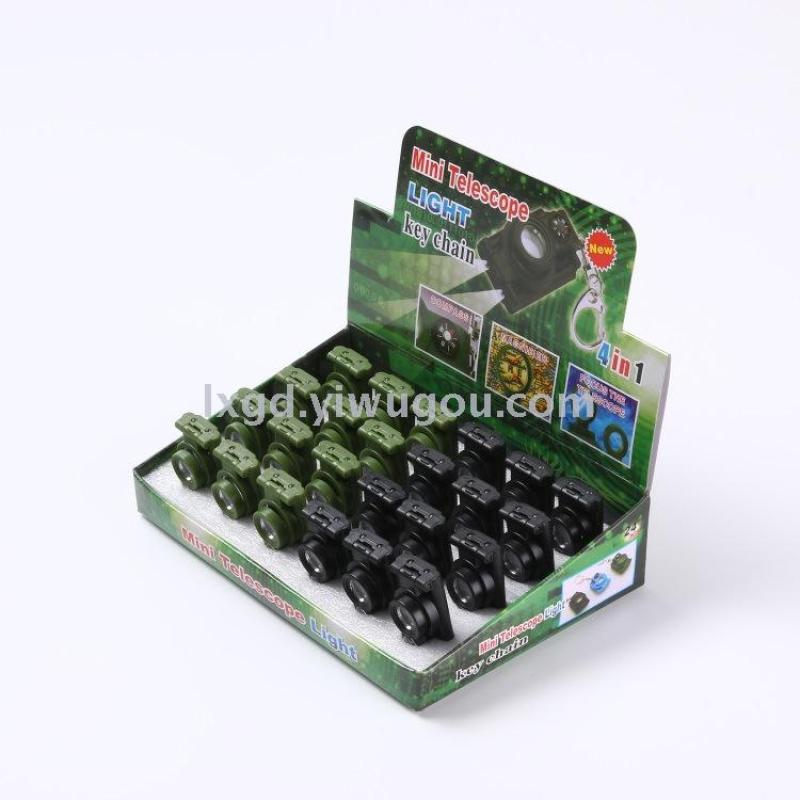 About Product:BW021 children's spy-glass single-tube folding telescope keychain toy with light, functional type: ordinary telescope, instrument magnification 3X, material: ABS, packaging: 24 pieces per display box, 480 pieces per piece. Conventional color: black dark green