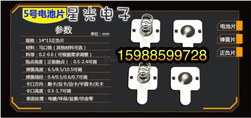 The factory mainly produces: 1. Battery sheets, 18650 battery sheets, battery tabs, standard battery sheets, battery positive and negative sheets, battery spring sheets, battery contact sheets, metal tabs, battery connectors, battery clamps, metal battery clamps, keystone battery spring sheets, button spring sheets, 23A battery spring sheets, 27A battery tabs, remote control battery sheets;Update time: