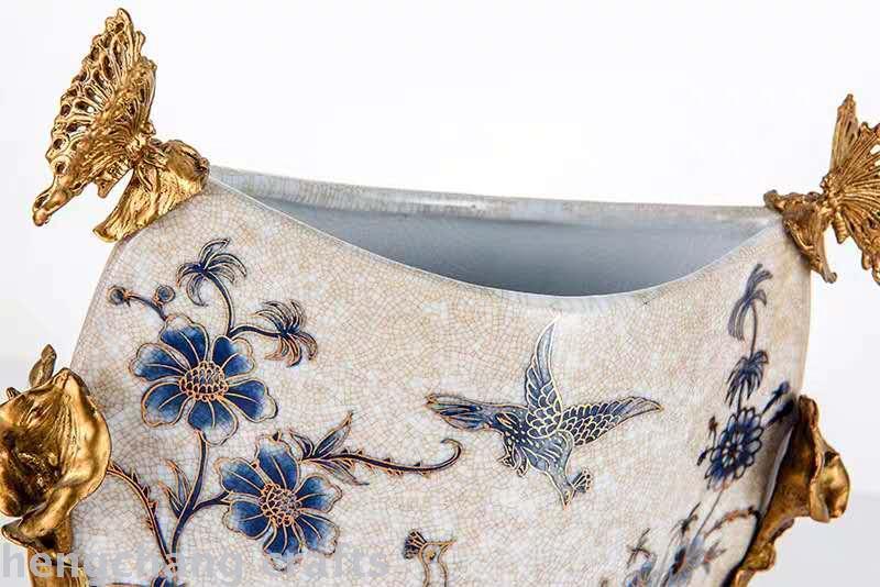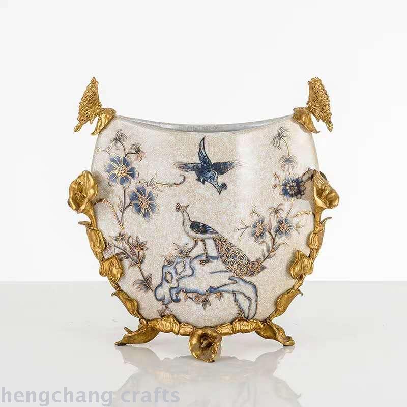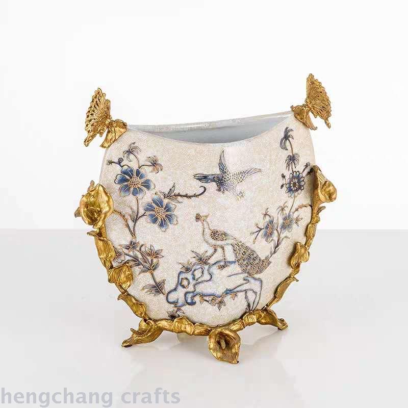 American Copper with Ceramic Gold Blue and White Vase Flower European Luxury High-End Home Decoration Living Room Decorative Flower Vase 中文版