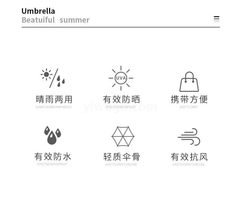 Main products: sun umbrellas, children's umbrellas, straight-stick umbrellas, two-fold umbrellas, three-fold umbrellas, multi-fold umbrellas, and automatic opening and closing umbrellas, etc.