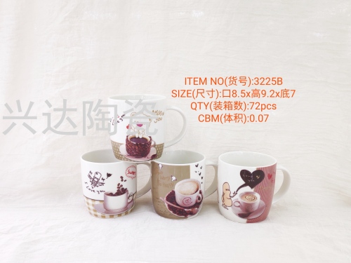 我公司生产的陶瓷茶杯,可用于办公室,家庭,工厂喝茶使用,也可以作为果汁,饮料等消费品的附属促销品赠送。陶瓷茶杯上还可以根据您的需要印制您需要的各种图片、添加公司LOGO图形和文字等,加工的礼品工艺陶瓷产品全部为高级工艺美术师精心设计,经过800度以上高温烧制而成的精美陶瓷艺术礼品,永不褪色变色。是温馨相送、友谊联络、喜庆贺礼、工商馈赠、师生情谊、敬意表达、励志名言及节日纪念等传达非凡感受的礼物,欢迎各界有识之士光临我公司参观指导。