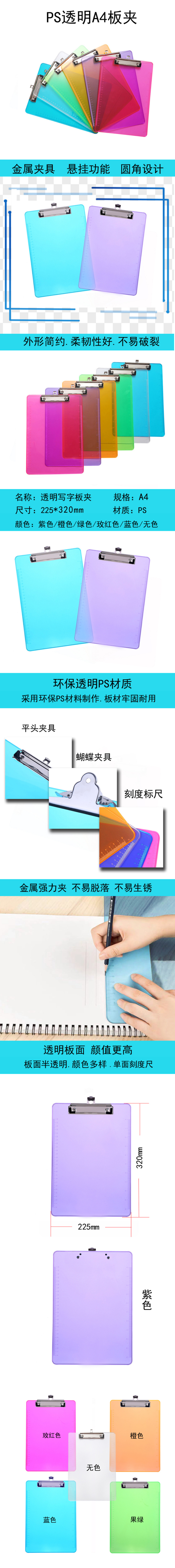 About Product:Name: transparent tablet clip specification: A4 material: PS color: blue Orange Green purple rose colorless