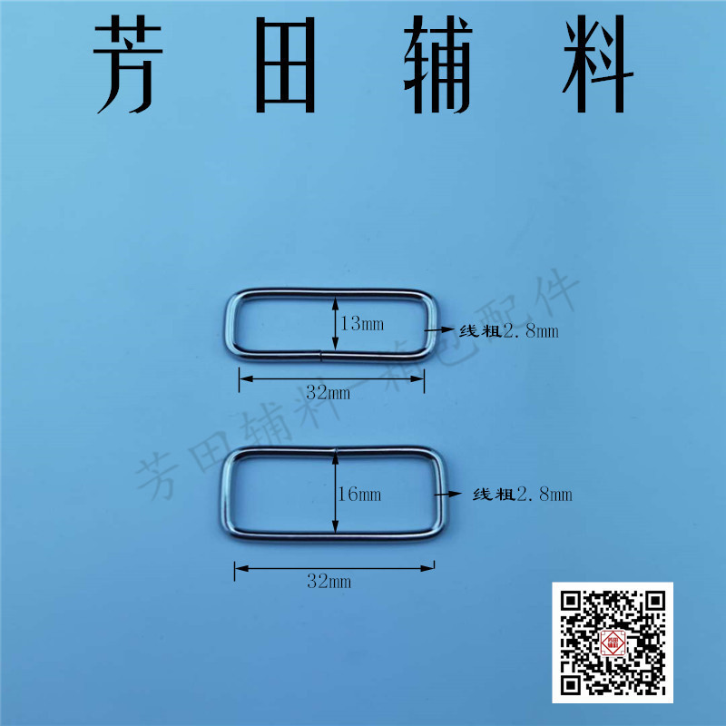 铁环铁丝方扣方形扣口字扣口子扣铁丝扣服装配料,规格为2.8线粗*32内径*16内高,主要颜色有白色,其它颜色可订做,量大从优。