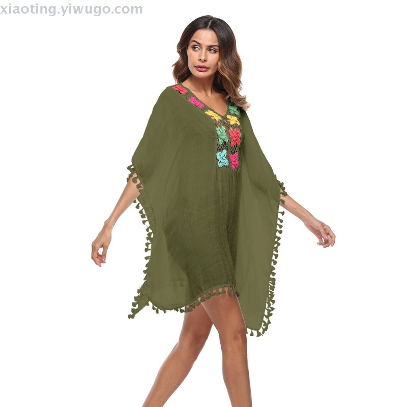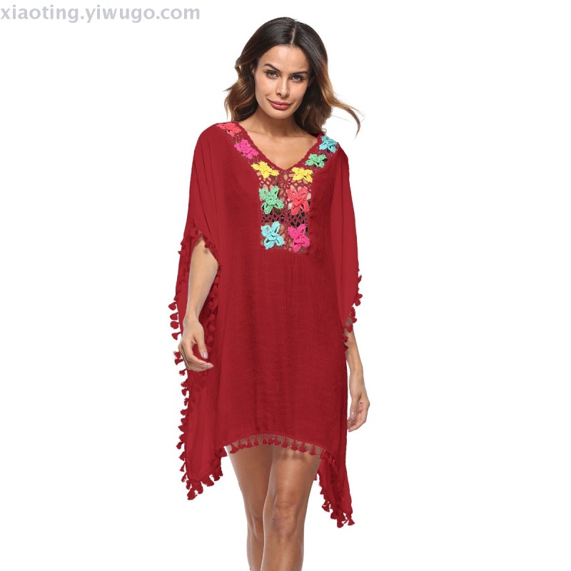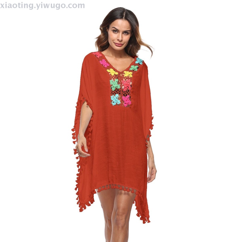 bikini foreign trade new sexy solid color handmade crocheted v-neck swimsuit outdoor beach skirt sun protection factory direct sales 中文版