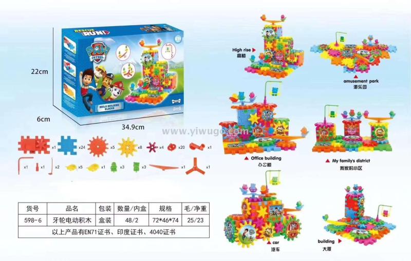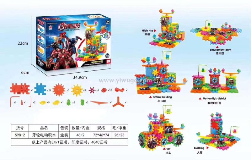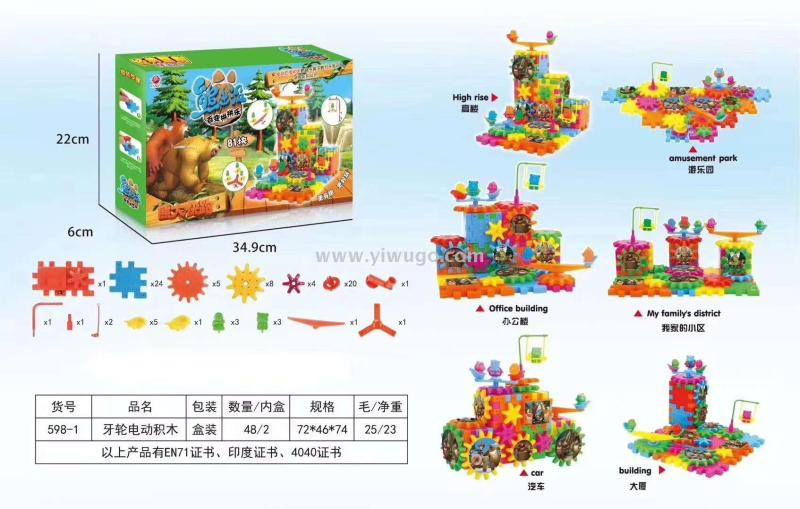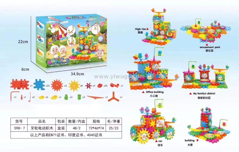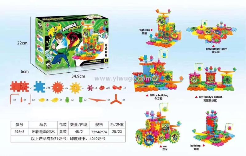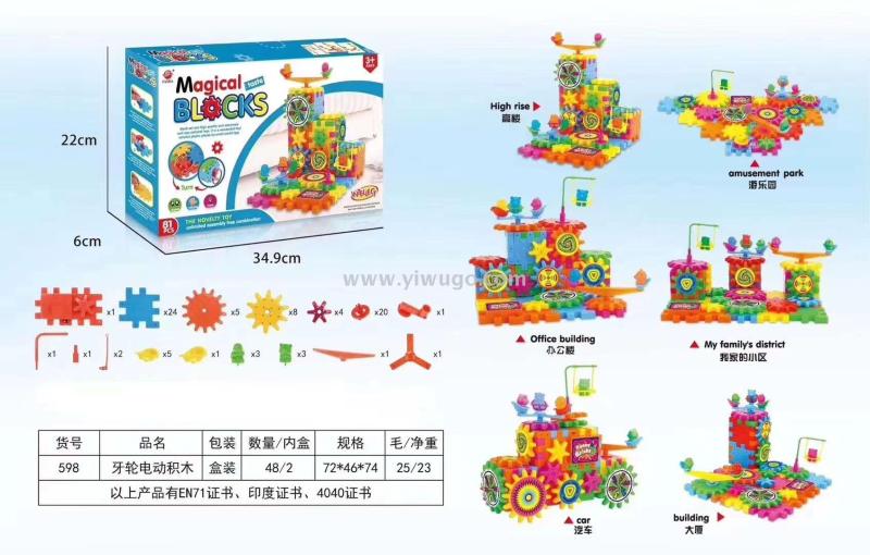 Product Description: This product is certified by EN71, Indian certificate, and 4040 certificate. It is a set of wheeled building blocks with 81 pieces in a box measuring 34.9*22*6cm. Children can freely combine and build various structures such as skyscrapers, amusement parks, offices, residential communities, cars, and skyscrapers. This can effectively stimulate children's spatial imagination, practical ability, and can also cooperate with each other to build blocks.