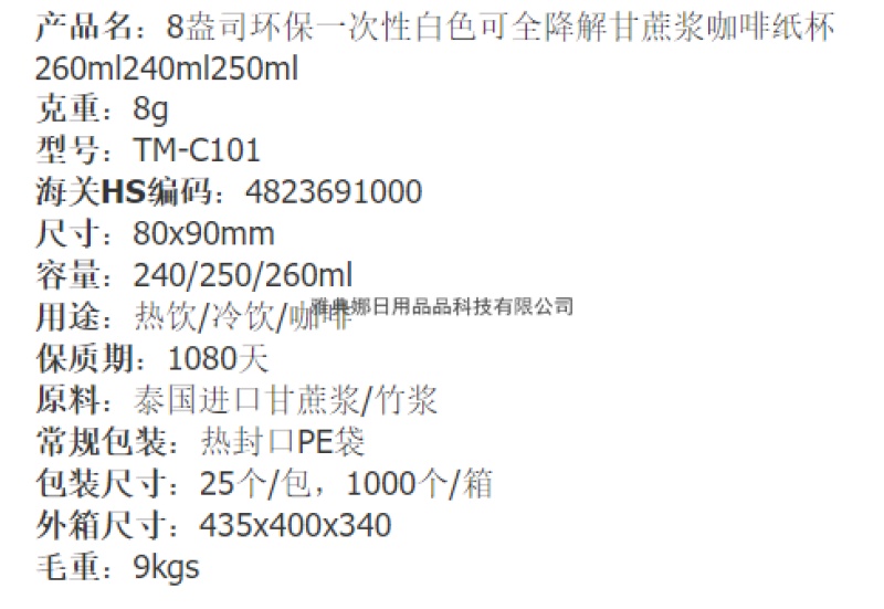 8 oz environmental protection disposable white fully degradable sugar cane pulp residue coffee paper cup 260ml240ml250ml 中文版