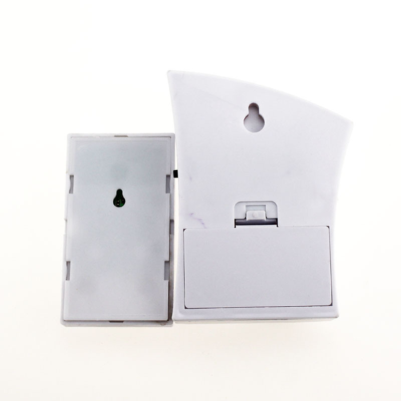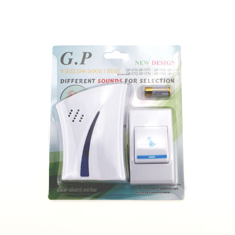 Material: ABS plasticRingtones: 32 songsSpecification: 75*100*30mmPower source: Dry cellPower supply voltage: 220VPower: 0.5WRemote control distance: About 100M
