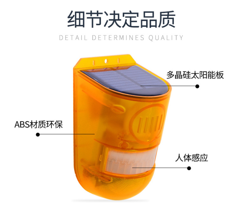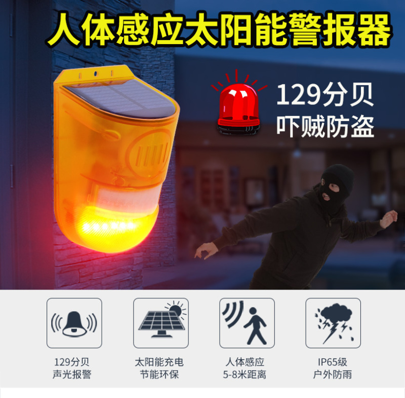 Function: 24-hour motion-activated sound and light alarm mode + 24-hour flash silent alarm mode + night sound and light alarm mode + night flash silent alarm mode