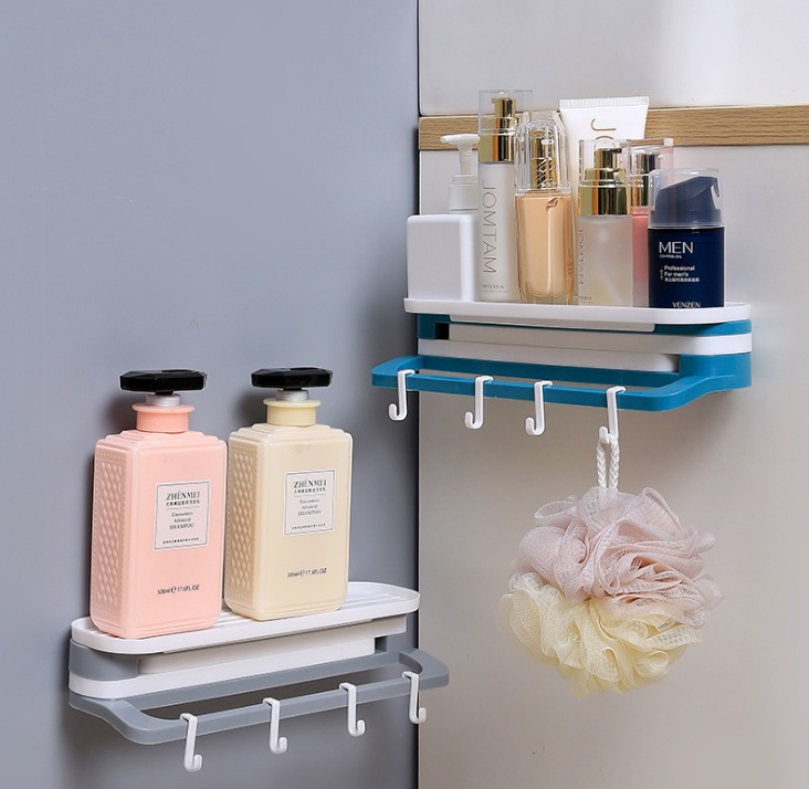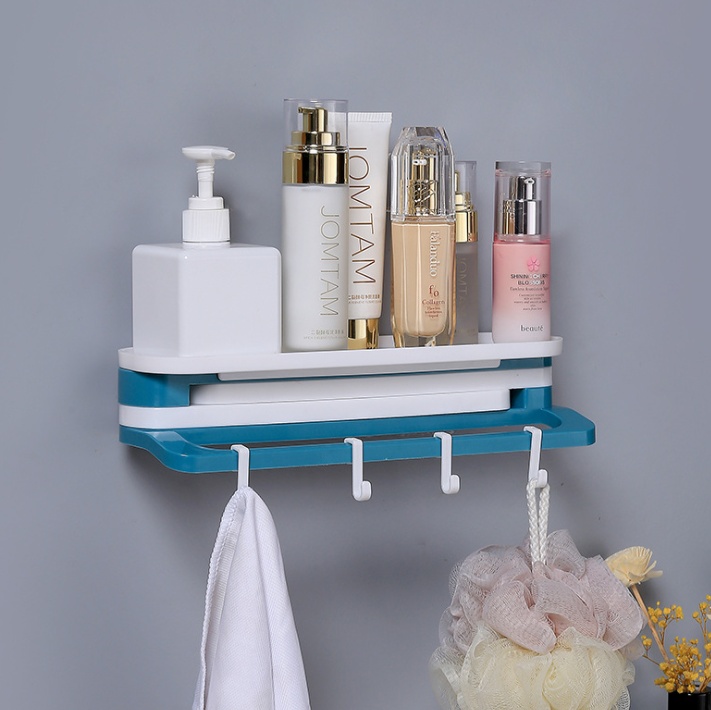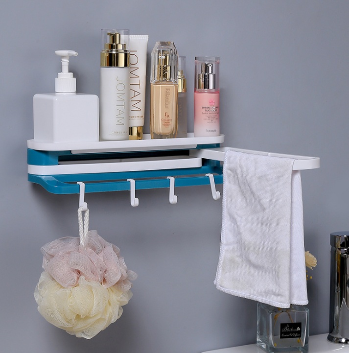 Free-hanging storage rack with foldable towel bar, wall-mounted storage rack with no marks in the bathroom, and invisible mounting system.