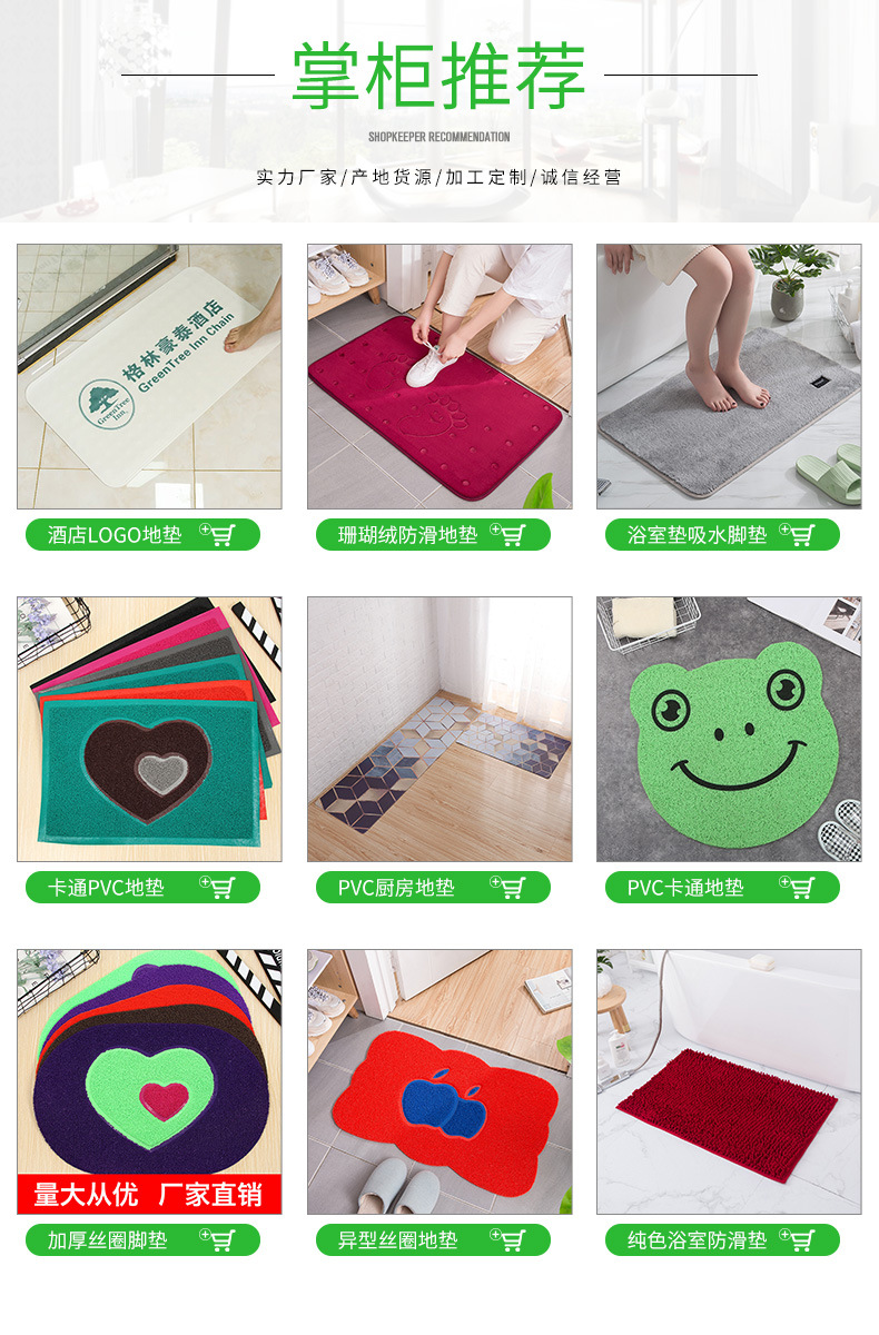 The product is made of high-quality PVC material, which is environmentally friendly and durable. The color is bright and durable, and it is not easy to fade. The full set of tough spray structure, scratching sand and mud, wear-resistant and anti-tension, anti-mold and antibacterial. It has excellent cleaning ability in a dry state; it has excellent cleaning ability and water absorption performance in a wet state. The spring design of the mat foot spring line, the feeling of stepping is soft and comfortable, easy to clean. The composite imported green environmental protection material, anti-static, fire resistance and flame retardant. The PVC anti-skid bottom, the effect of sliding on the ground is better, and it is sold worldwide. Various specifications and sizes. | ||||