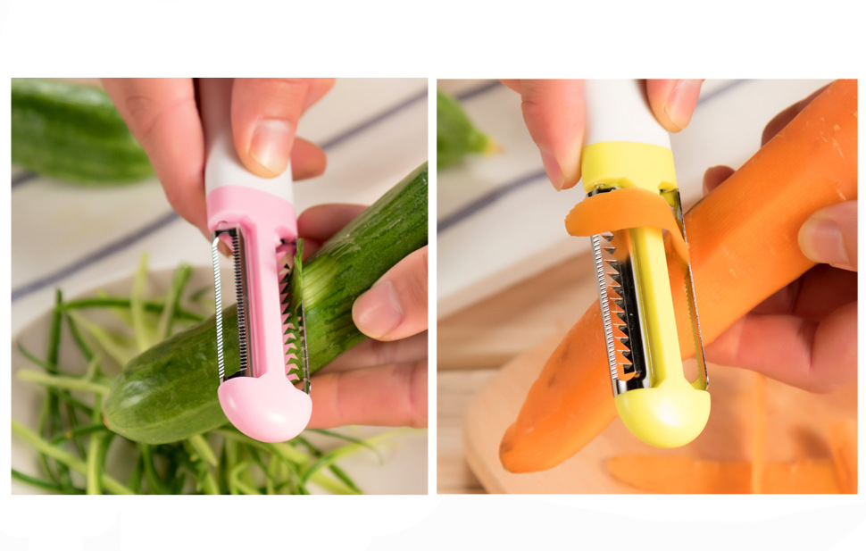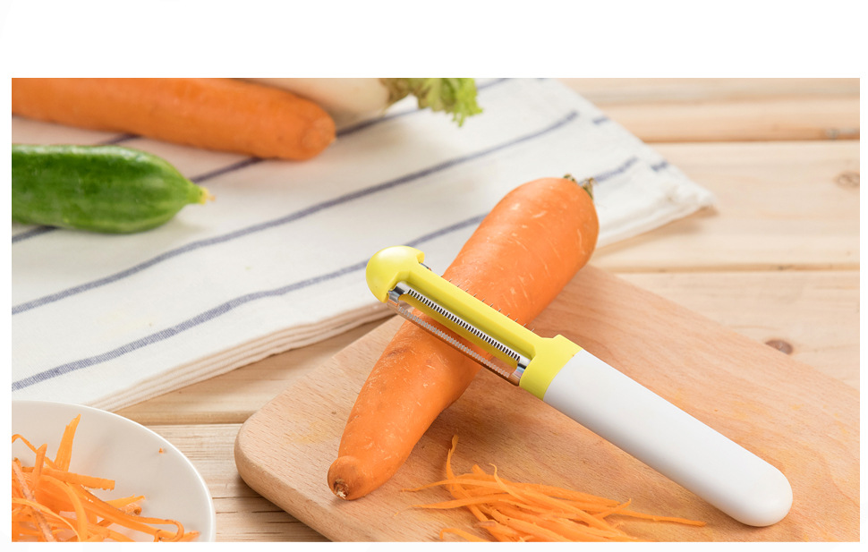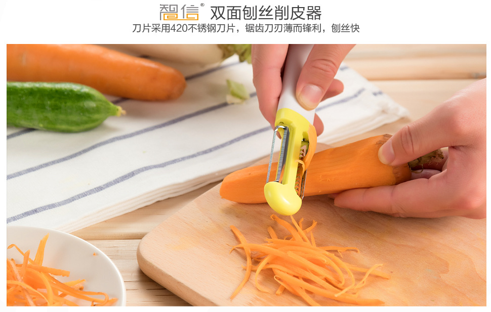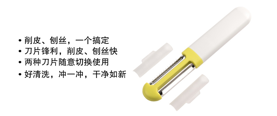 【功能特点】这款设计独特的刀削器,创造性地将削皮和削丝合二为一,即能轻松削皮,又能削各种蔬菜丝。削皮器外形美观大方,