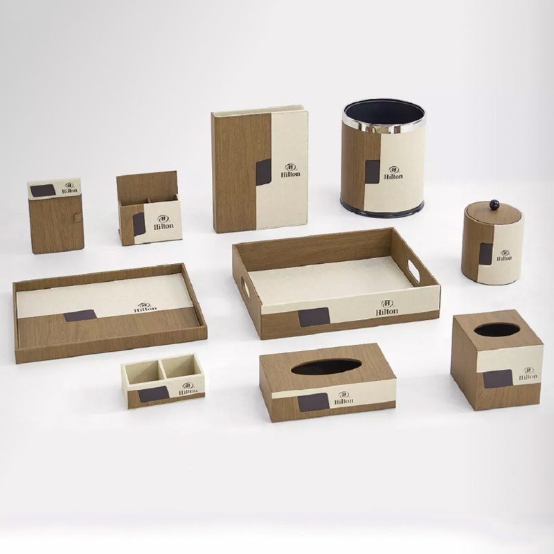 twoHotel room supplies (hotel leather goods products, hotel acrylic products, mini-fridge, safe, hair dryer, electric kettle, towel basket, trash bin)