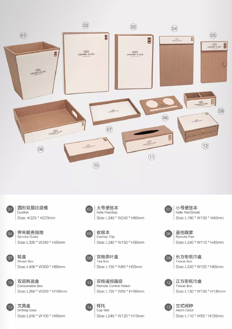 twoHotel room supplies (hotel leather goods products, hotel acrylic products, mini-fridge, safe, hair dryer, electric kettle, towel basket, trash bin)