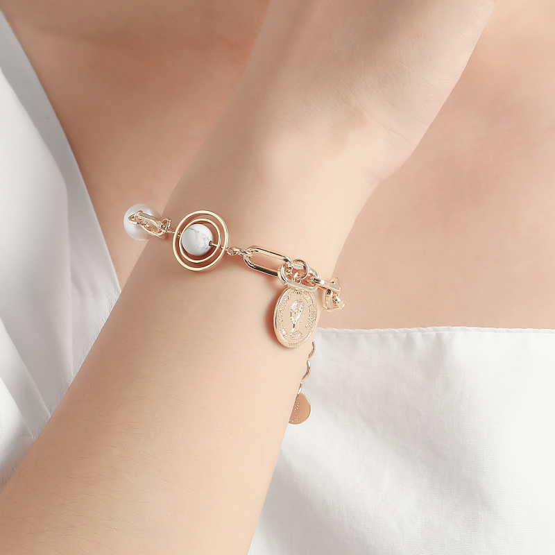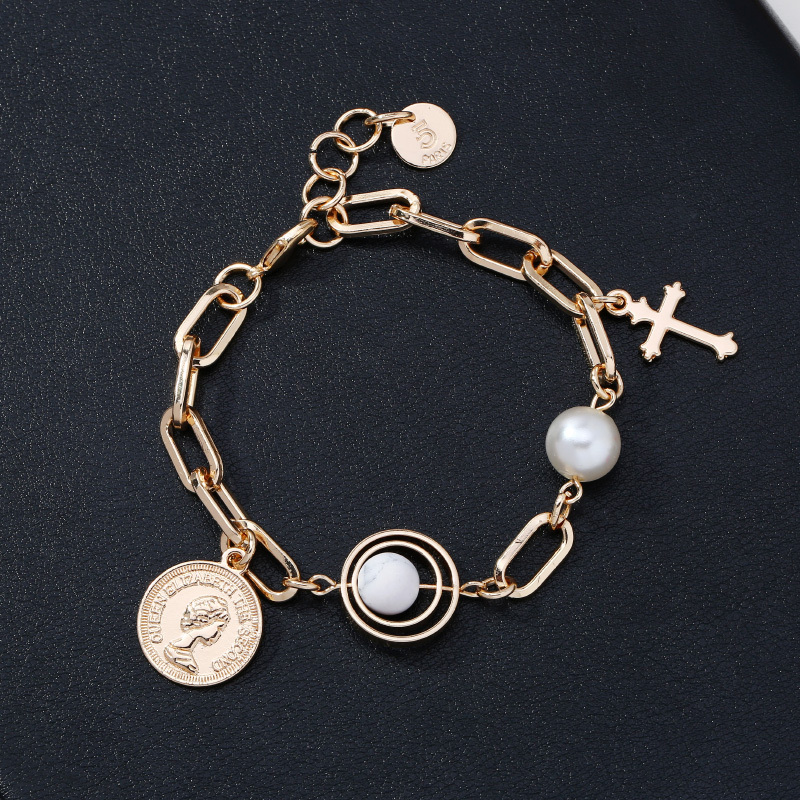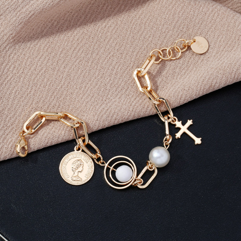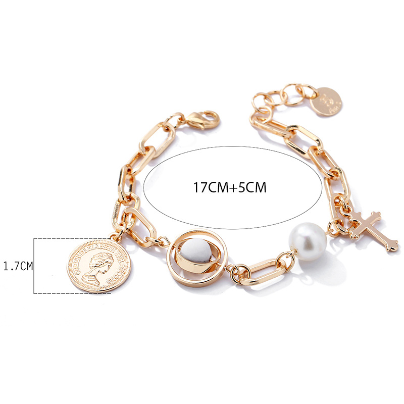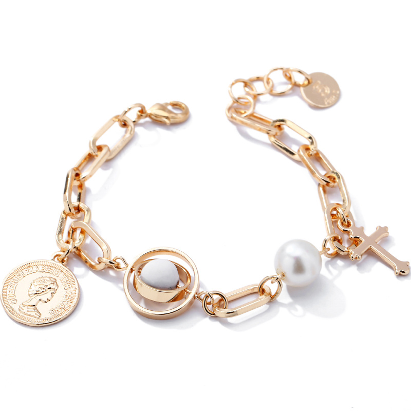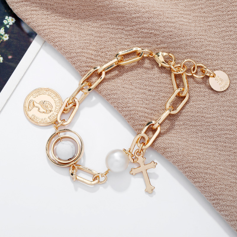 European and American Popular Portrait Coin Pendant Bracelet Multi-Element Cross Pendant Alloy Pearl Bracelet Ornament Wholesale 中文版