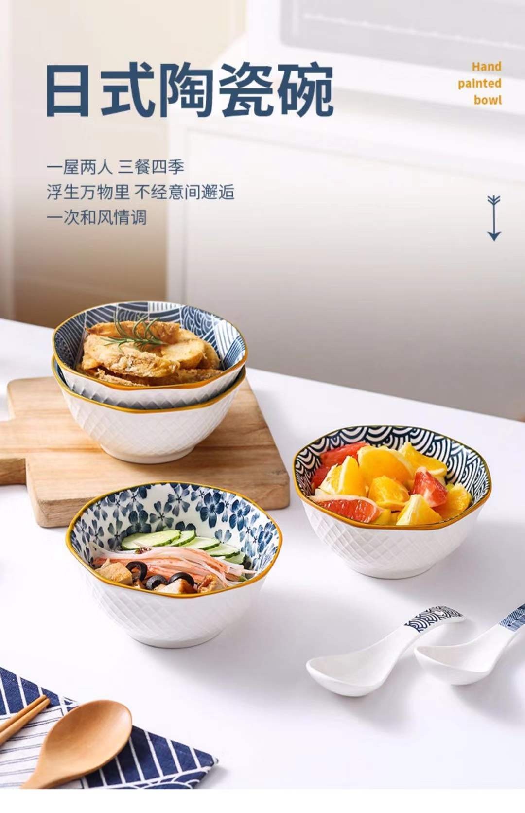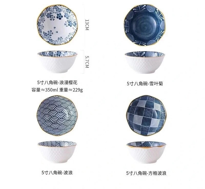 日系和风手绘5寸八角碗2碗彩盒陶瓷套装