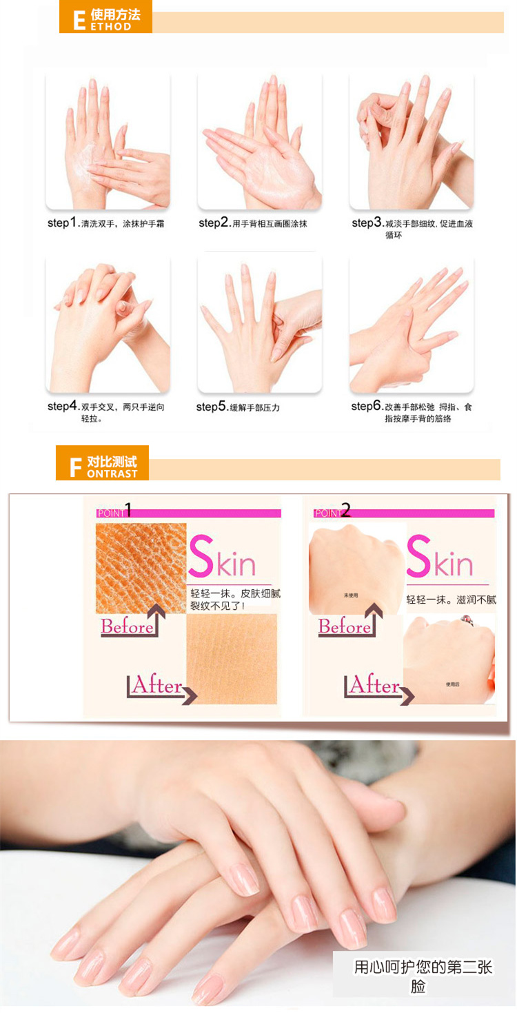 使用方法:取适量本品涂于手部,双手交替轻轻按摩2-3分钟可达到的护手效果,快速吸收。长期使用,将会使您拥有一双柔嫩如玉的纤手。