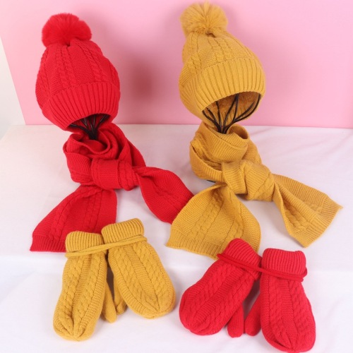 winter new children's thick warm knitted hat scarf gloves three-piece set baby plus velvet twist wool hat