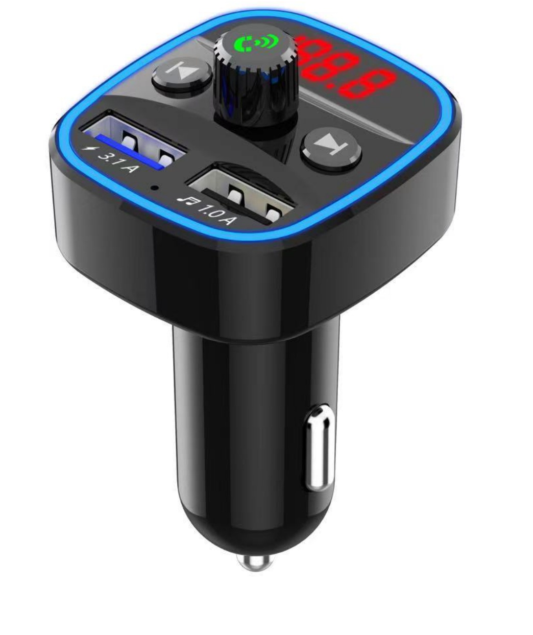 Car Bluetooth version 5.0, function: monochromatic lamp, answer the phone, Last Song, next song, FM transmission channel can be switched at will 87.5-108.0, use USB,TF, charging: 2.1A 1A working distance: 12metres display screen: Red light screen