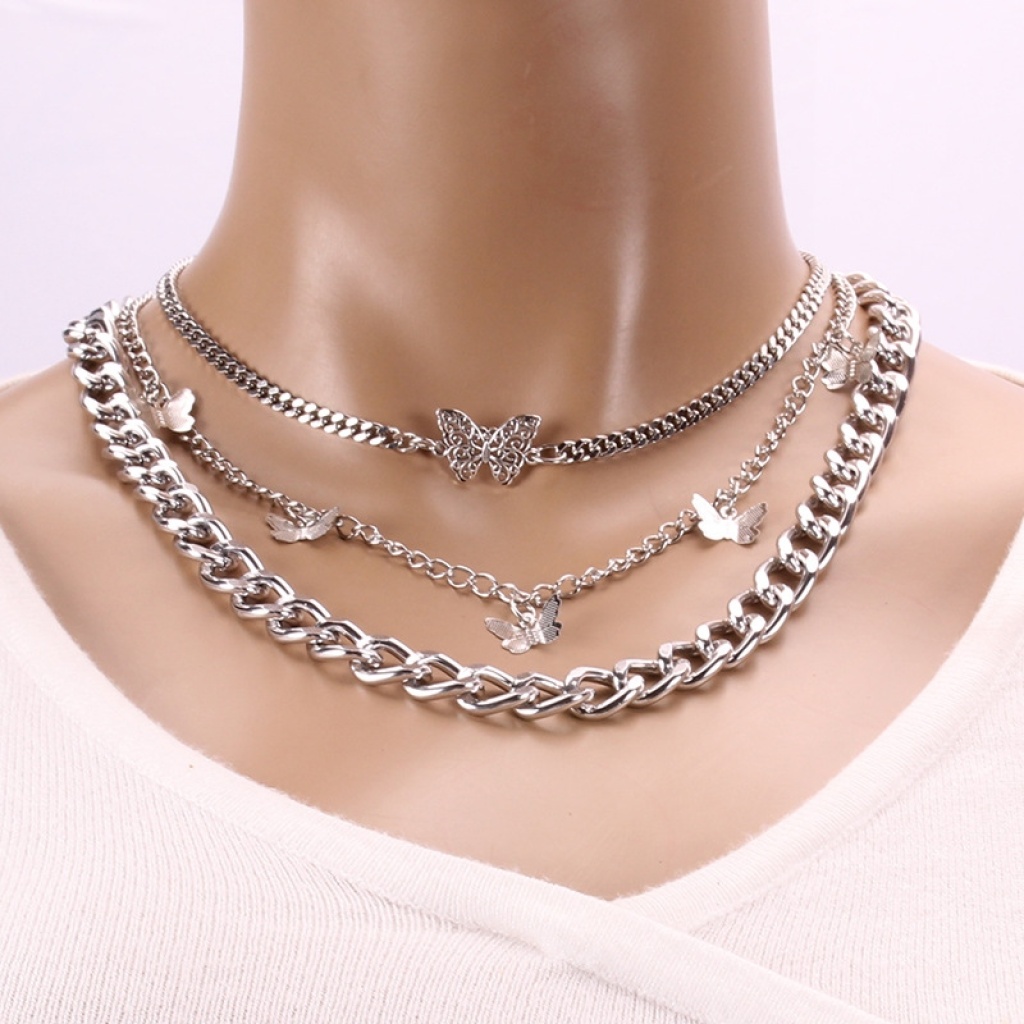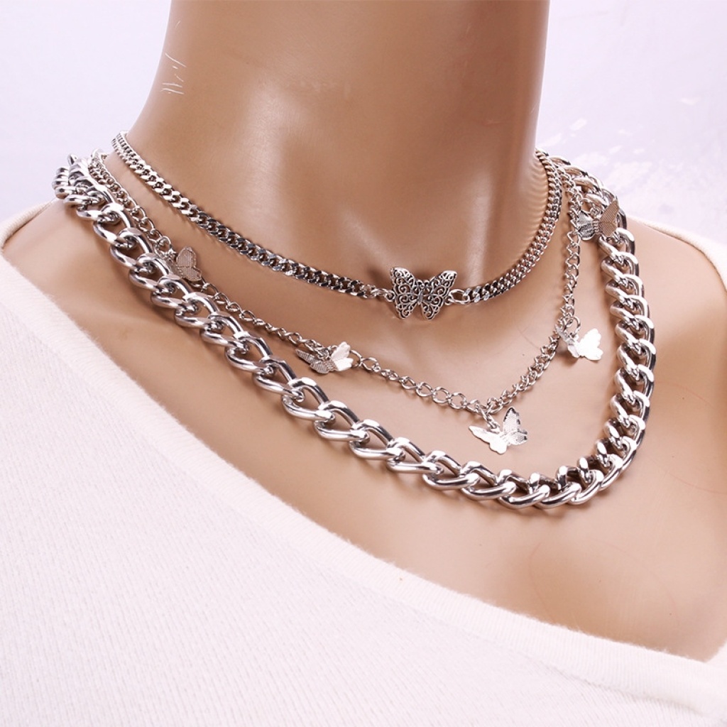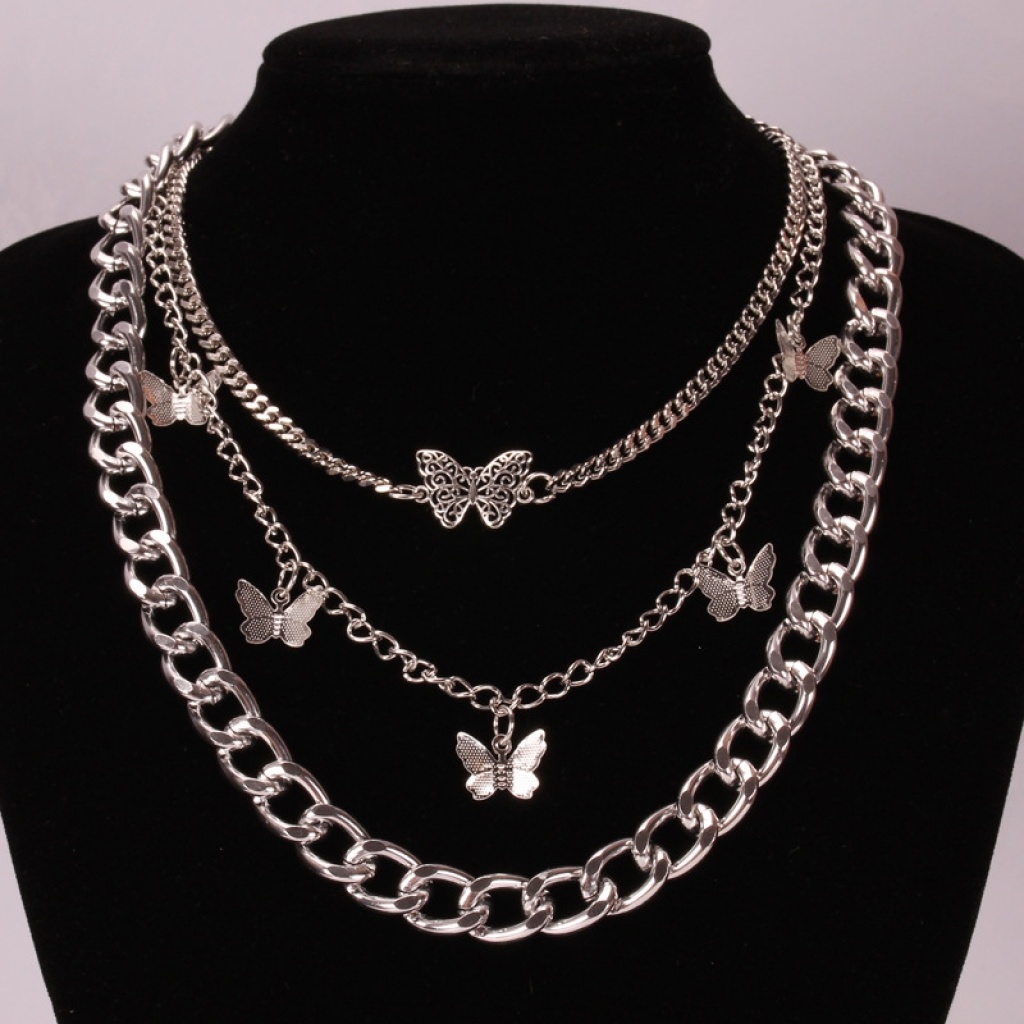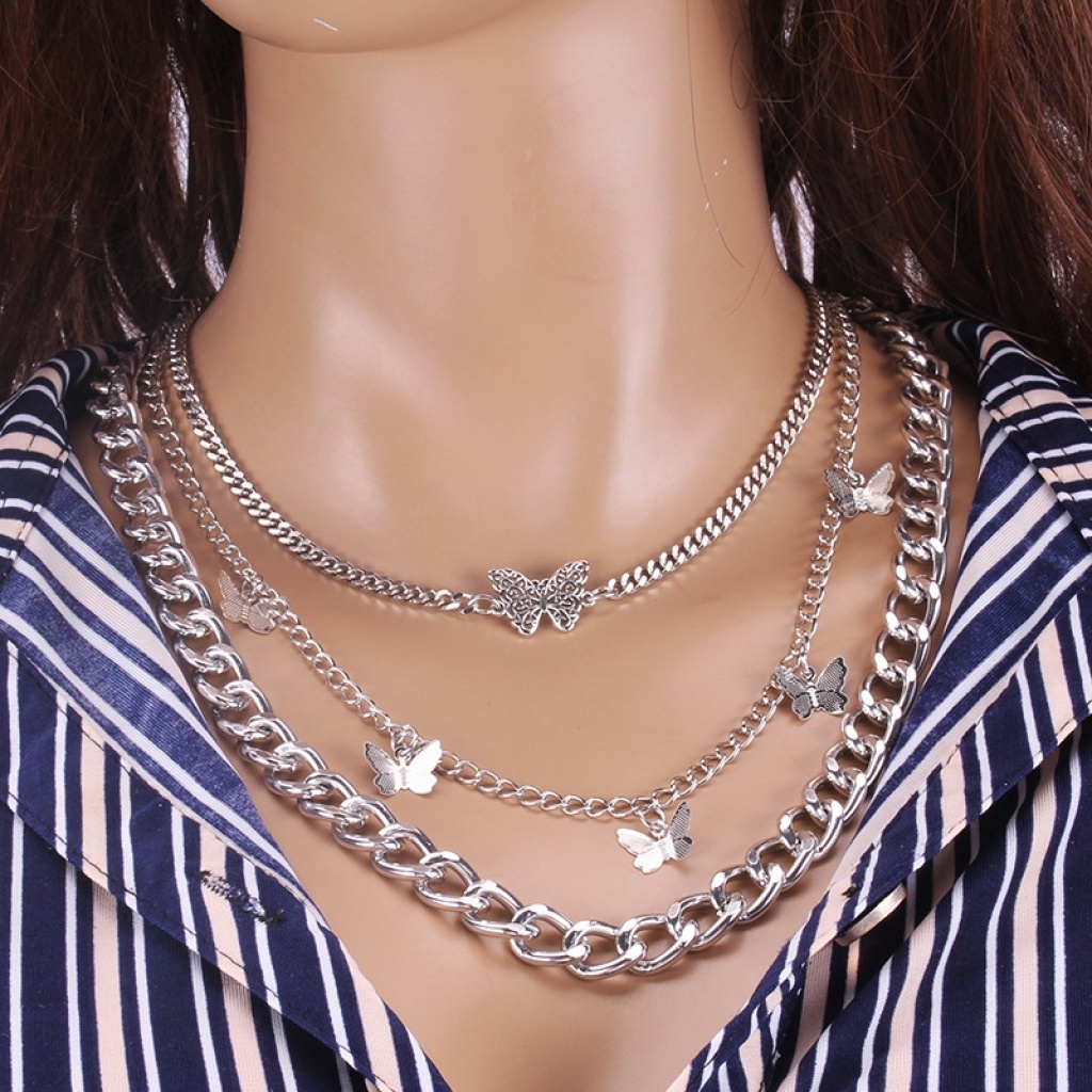 europe and america cross border new retro thick straps double-layer butterfly pendant female geometric creative elements fashion trend necklace 中文版