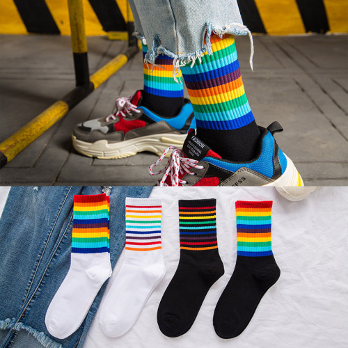 Rainbow Bar Socks Women's Korean Style Long Spring and Autumn Cotton Instagram Mesh Red Tide Socks All-Match High-Top Men's and Women's Same Socks 中文版