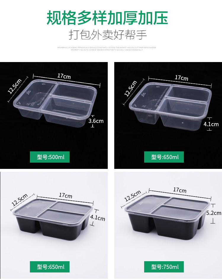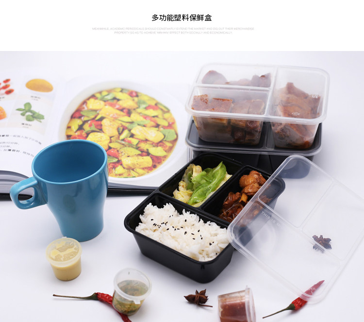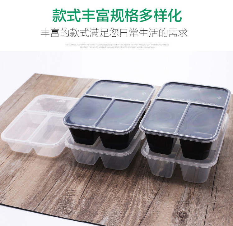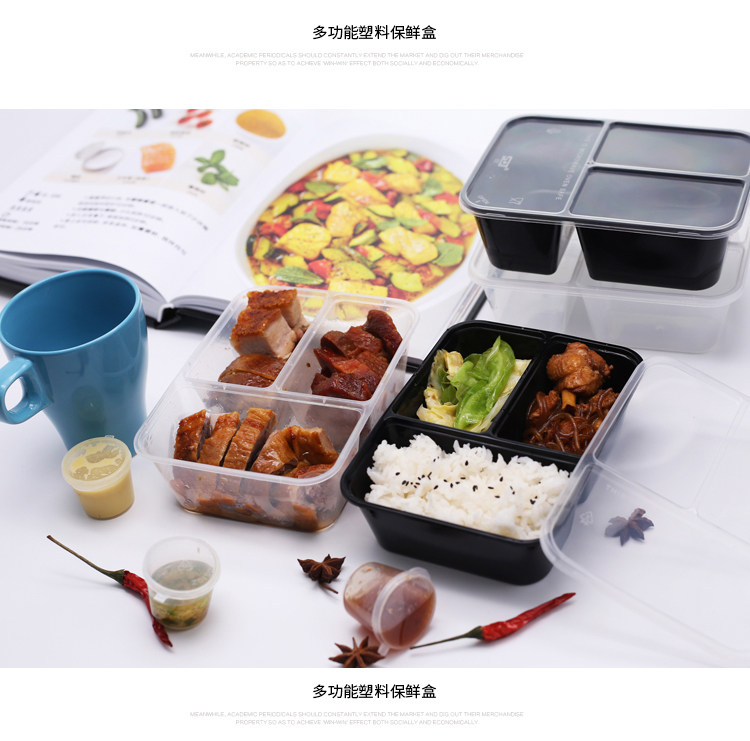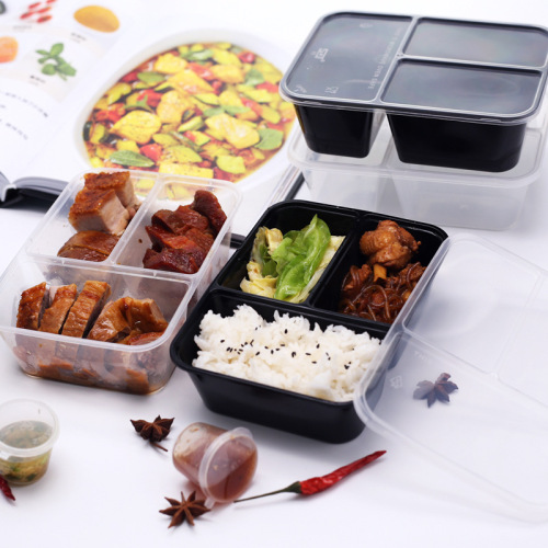 500/750/1000ml three-grid rectangular lunch box disposable takeaway packing box black transparent fast food box