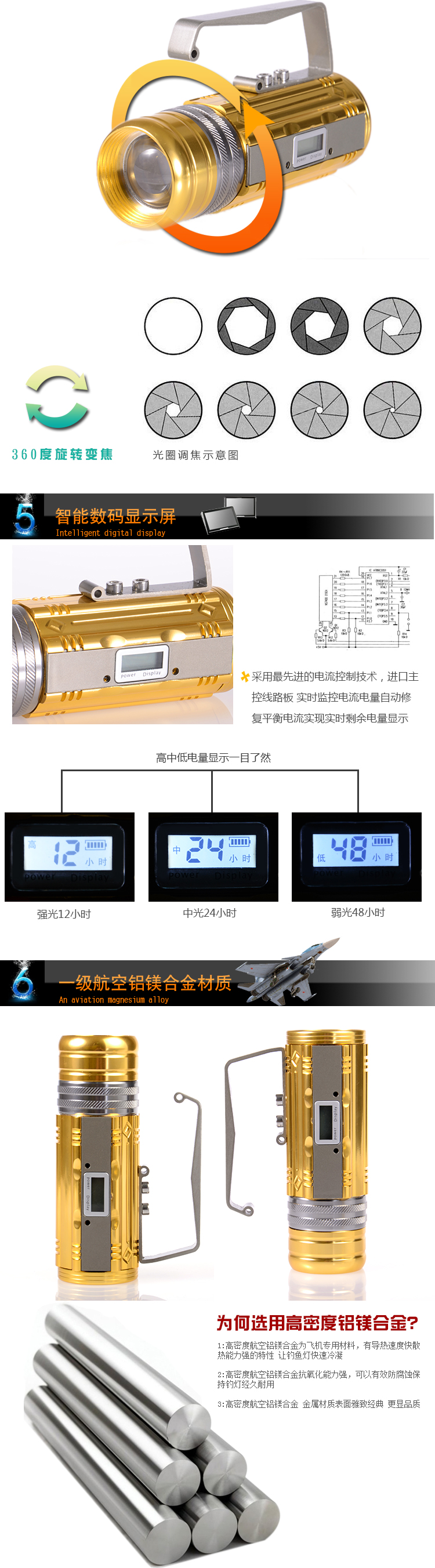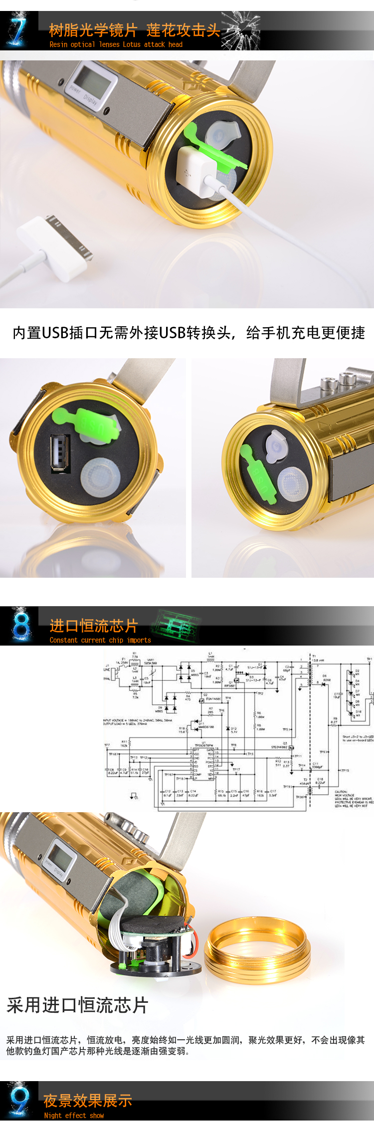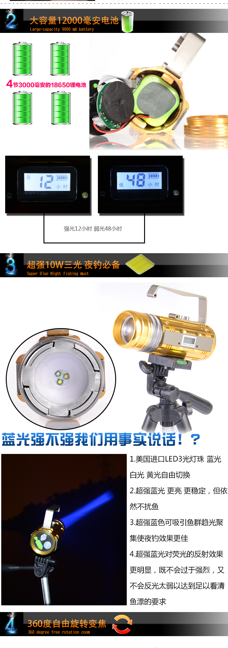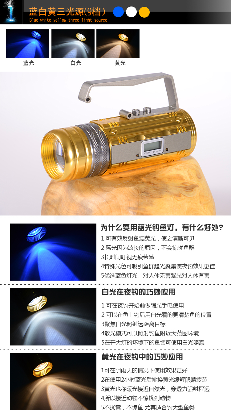 This year's popular local gold,2014 new night fish luring lamp- with display screen,9 gear dimming (3 white Light+3 blue light+3 yellow light), four sections18650 battery, super capacity,10W ultra-high brightness, ultra-long discharge time (strong light10 more than hours)