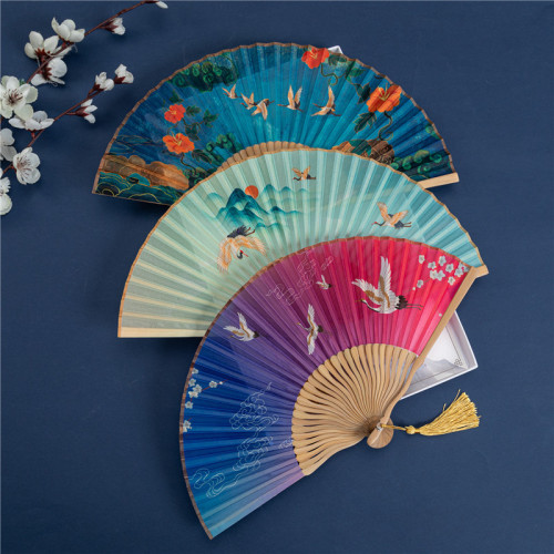 The fan originates from China, and it was introduced to Japan. The folding fan was invented in Japan and then introduced to China. The fan bones of the folding fan are made of bamboo, and the fan surface is made of pure silk, juan silk, or cotton cloth, paper, etc. The fan surface needs to be treated with alum silk, folded surface, or painted, sprayed, or screen printed. The high-quality original bamboo is selected locally and processed through steaming, shaping, polishing, and matching surfaces, among other more than 50 processes to create a delicate and exquisite craft fan.