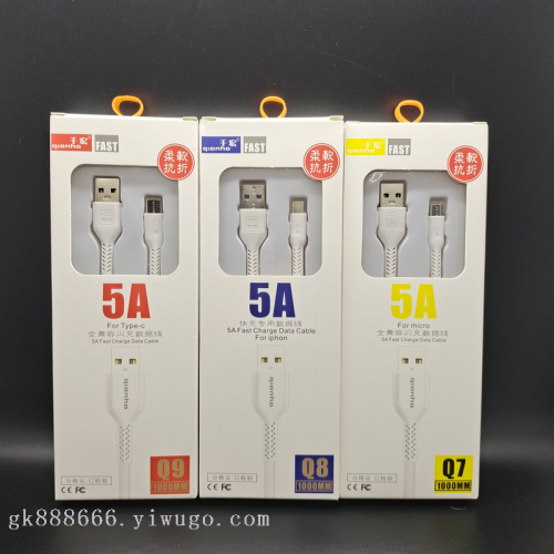 6A line Qianhong Q7-8-9 line 1 m 100 copper wire neck protection anti-break, bold flash charging line. Features: The Interface part is made of high-end gold-plated material, which effectively avoids oxidation and rust and prolongs the service time of the data cable. Charging and transmission are two-in-one, giving full play to performance, ensuring charging and data transmission are synchronized, saving time. The wire is made of American Standard tinned enameled wire, which takes into account the extremely fast charging efficiency and stable data transmission.600 pieces per box