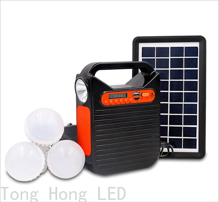 6: A 9V 3W solar panel, 3 light bulbs, 1 to 4 charging cable, AC charging cable