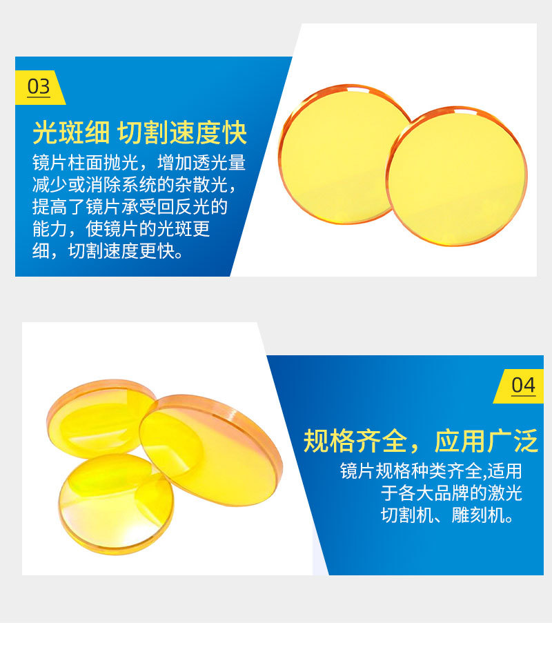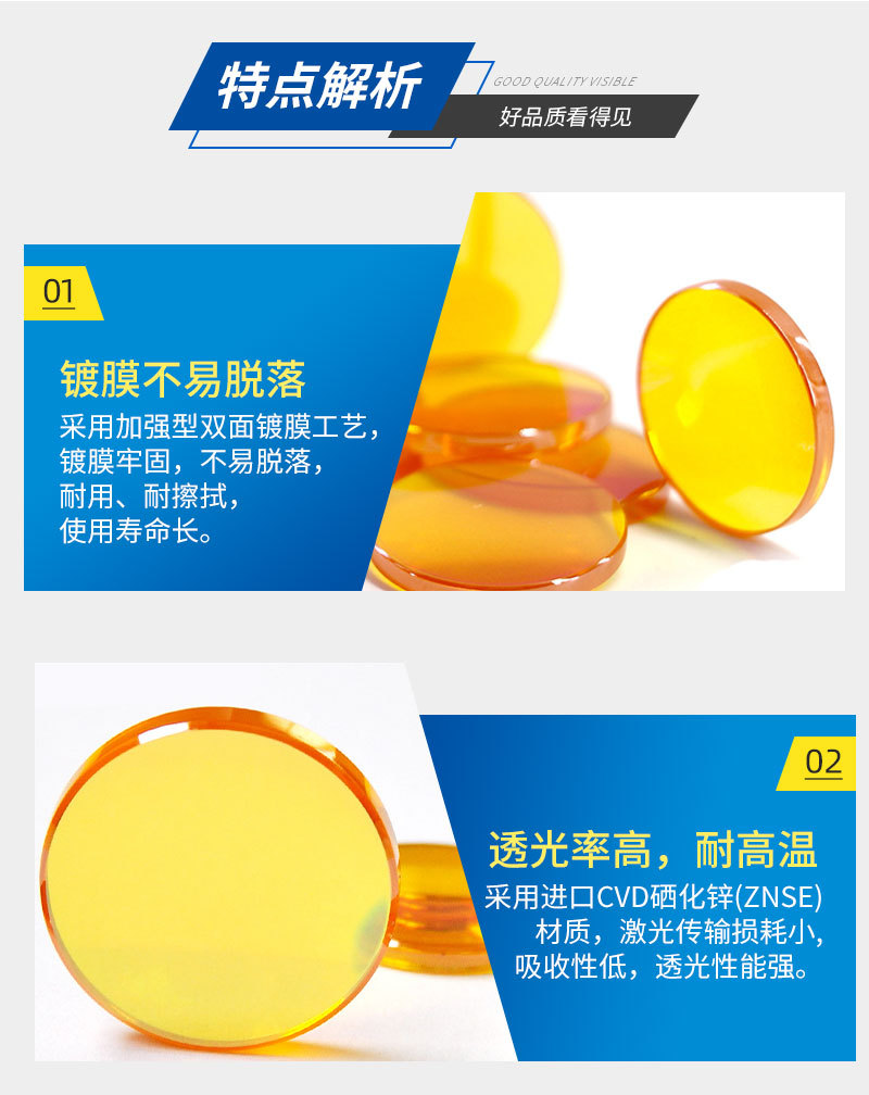 The American-imported zinc selenide material has a fine light spot and high transmittance rate, capable of withstanding high-power lasers, and is less prone to cracking.