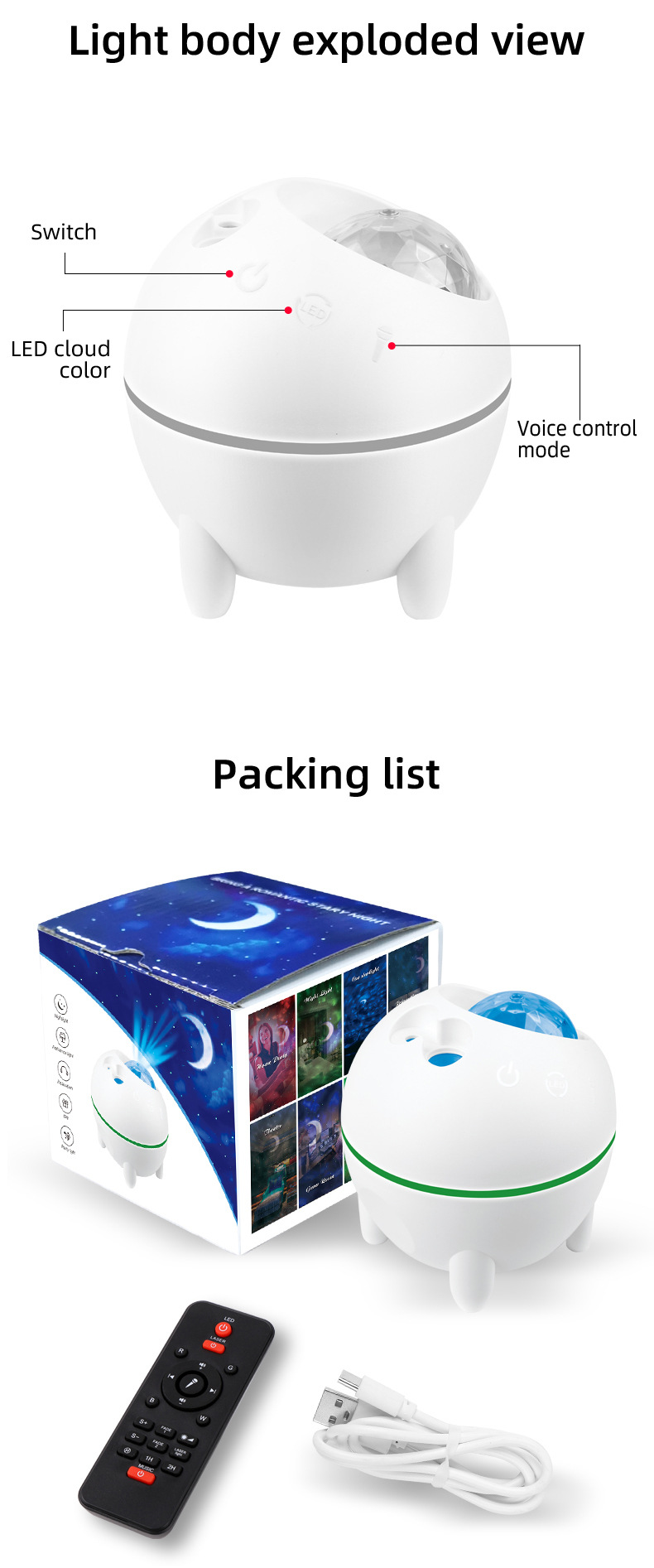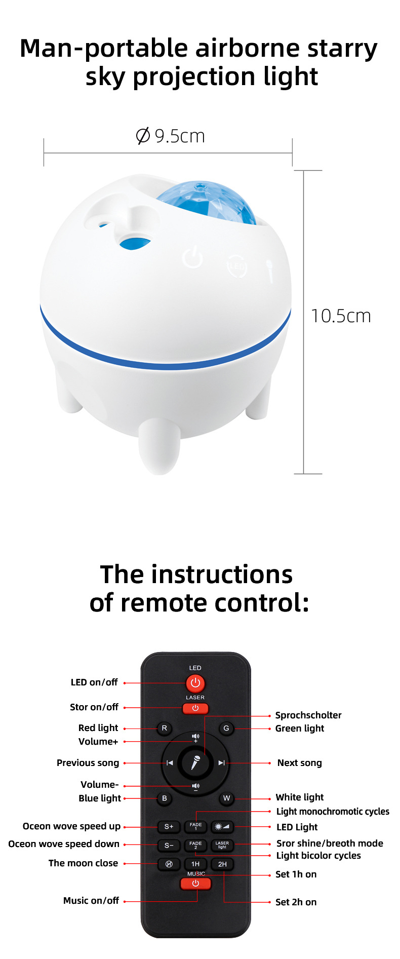 • 【遥控和自动关闭定时器】无需担心上下床或沙发打开或关闭夜灯,使用遥控器控制星星投影灯。内置高品质扬声器,支持无线播放音乐。 一旦打开声音控制模式,灯光将同步音乐,创造身临其境的声音和视觉氛围。星空与音乐可以带给您视觉与听觉上的双重享受。