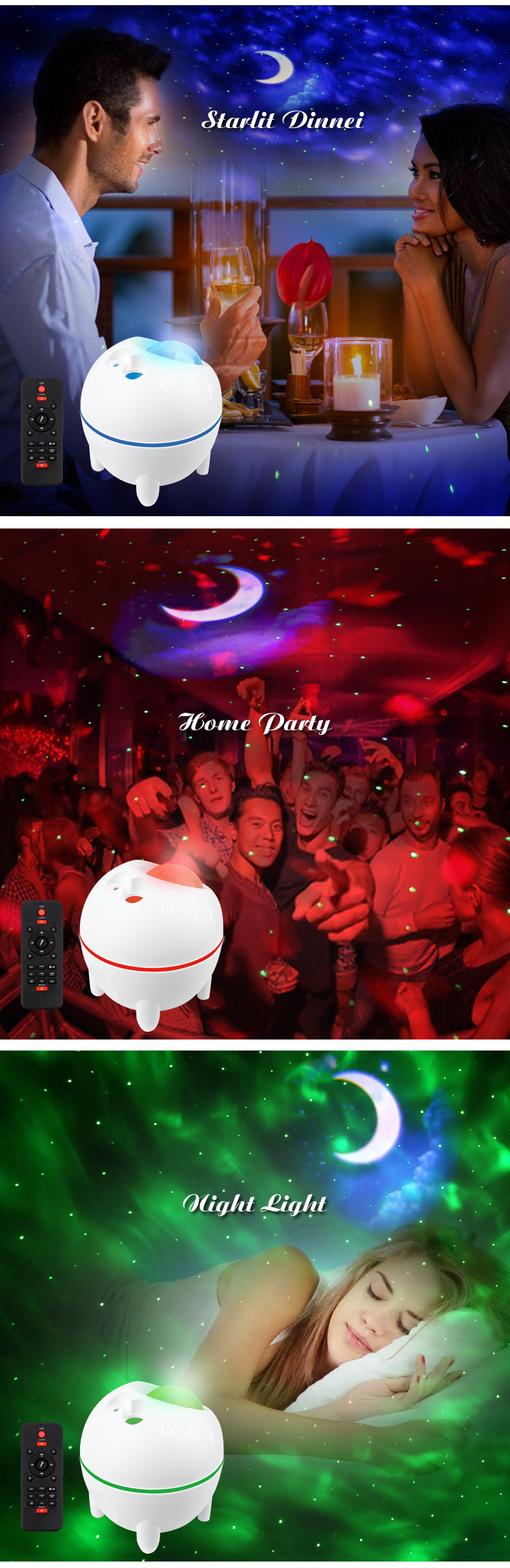 • 星空光投影仪具有星星、月光和星云,可组合成 40 种不同的星空照明模式,以混合搭配。 结合静态或动态的夜空投影速度,适用于卧室和儿童房,创造不同的星光投影发光氛围,请享受这一休闲和浪漫时光。