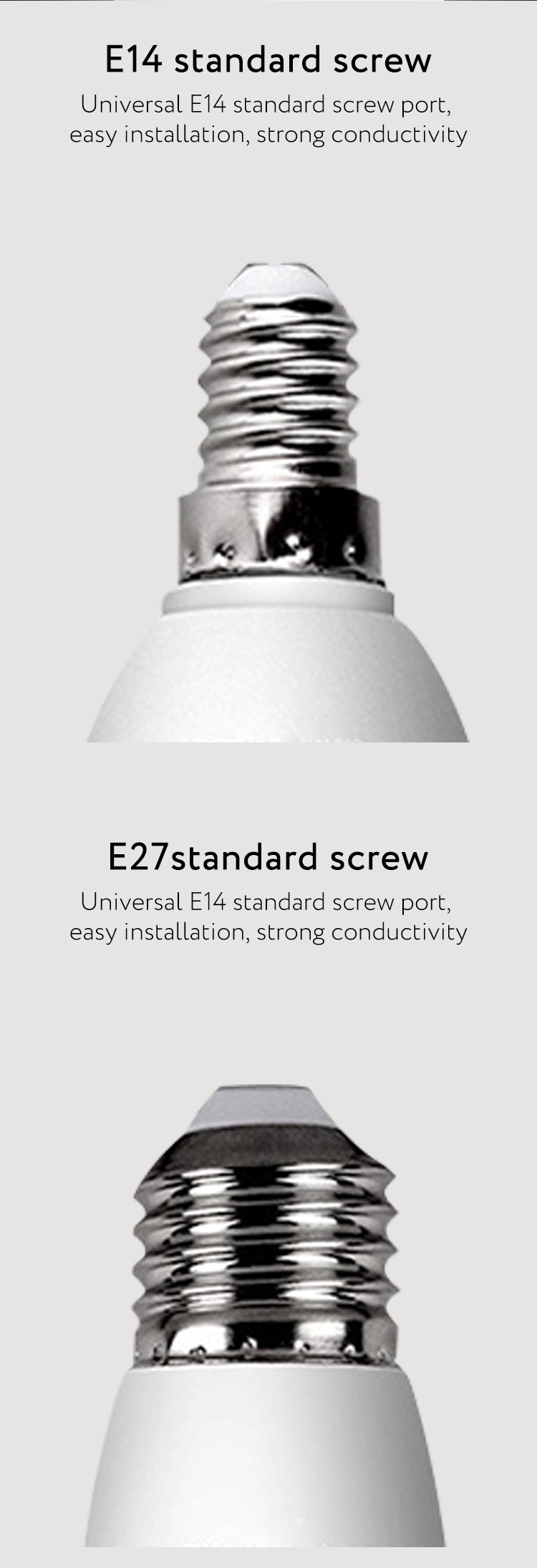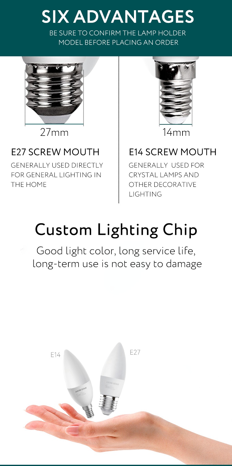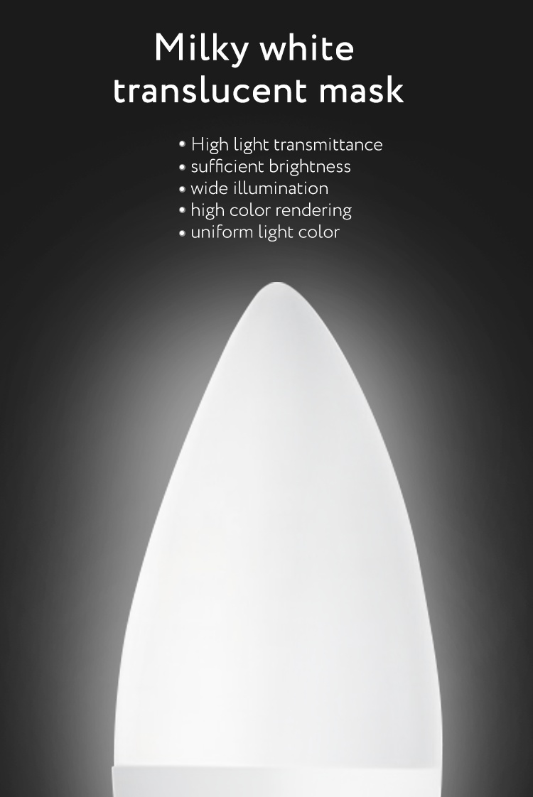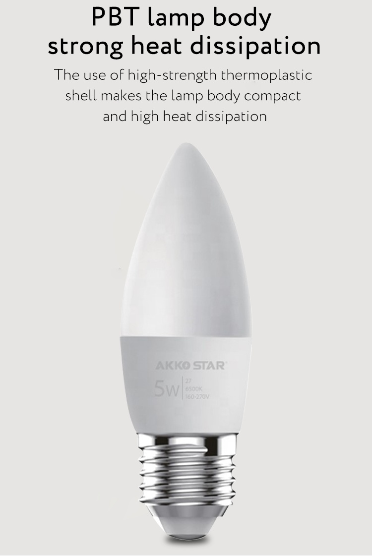 About Product:C37-5W, actual wattage 5W,PF>0.5,Ra ≥ 80, luminous efficiency ≥ 90LM/W, voltage AC175-265V, aluminum nickel-plated lamp holder, non-isolated, Shell PBT + PC