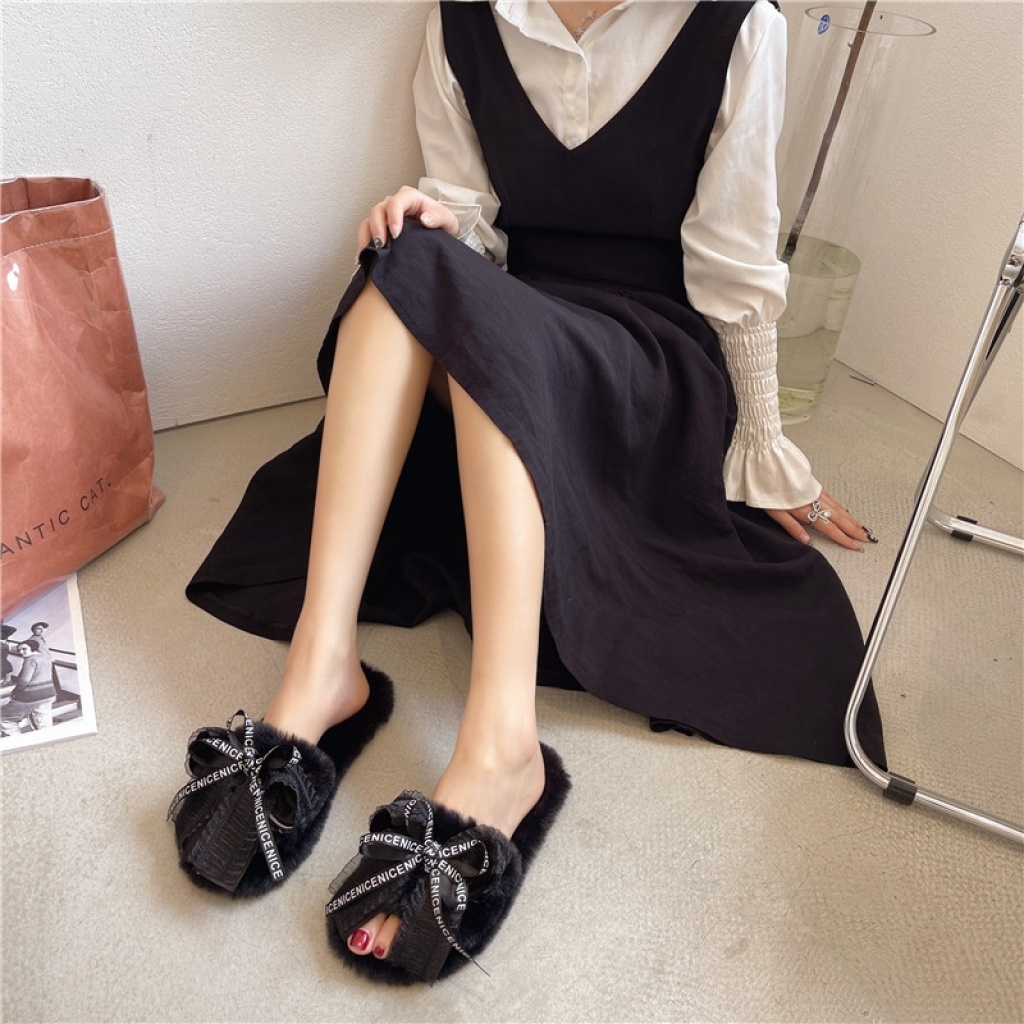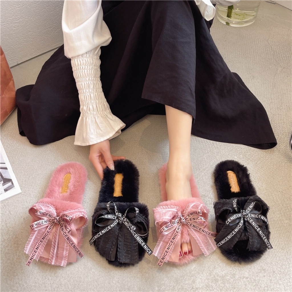 sweet bowknot women's shoes fashion woolen slipper open toe plush shoes factory direct sales 中文版
