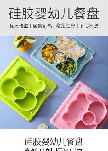 Children's Dinner Plate Grid Snack Catcher Baby Tableware Cartoon Cute Baby Silicone Drop-Resistant Solid Food Bowl