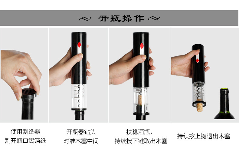 【Features】Simple operation. Install the 5th battery according to the positive and negative markings, and when using, press the "Start" button at the bottom.Press the button" to remove the cork, and hold the "reverse button" at the top to exit the cork.