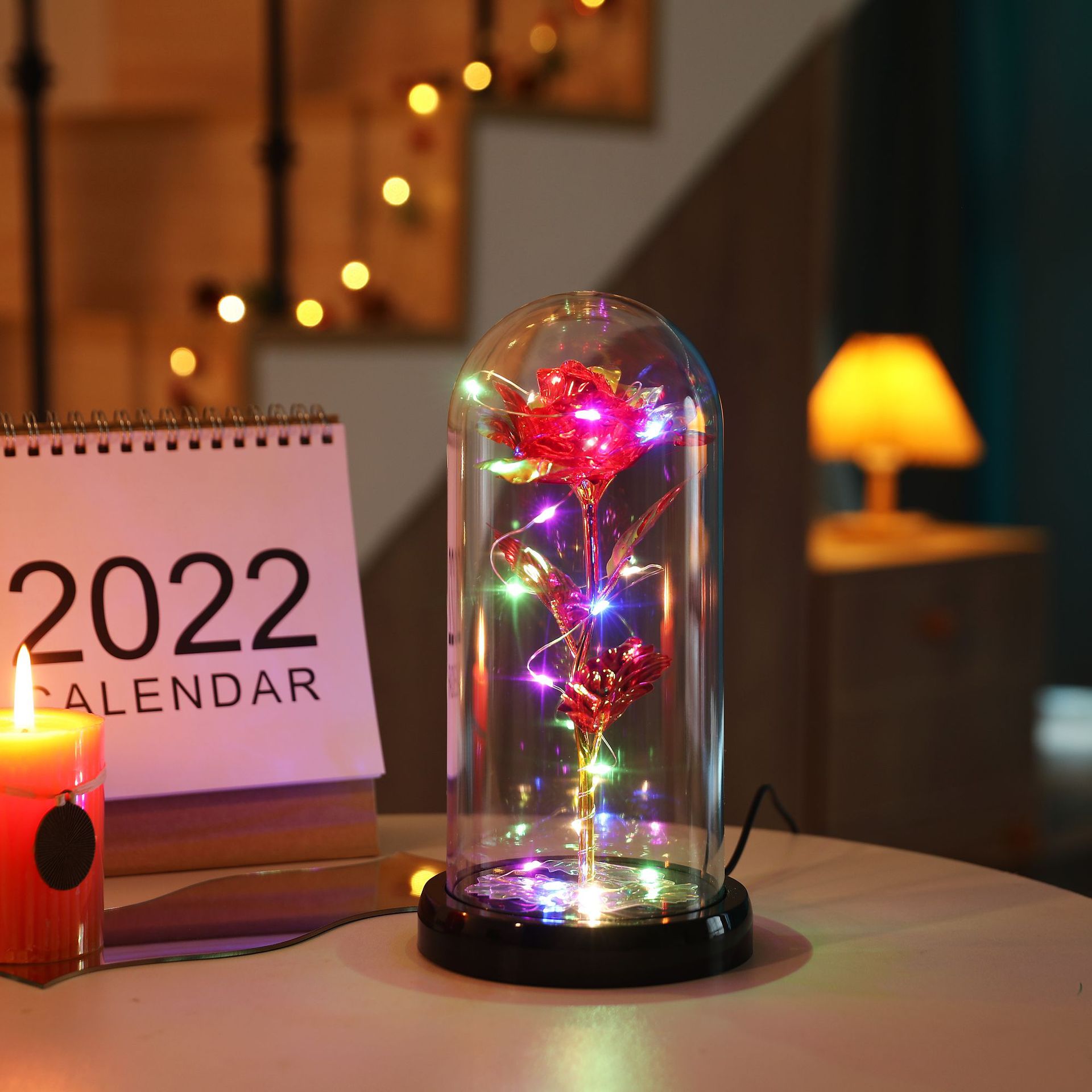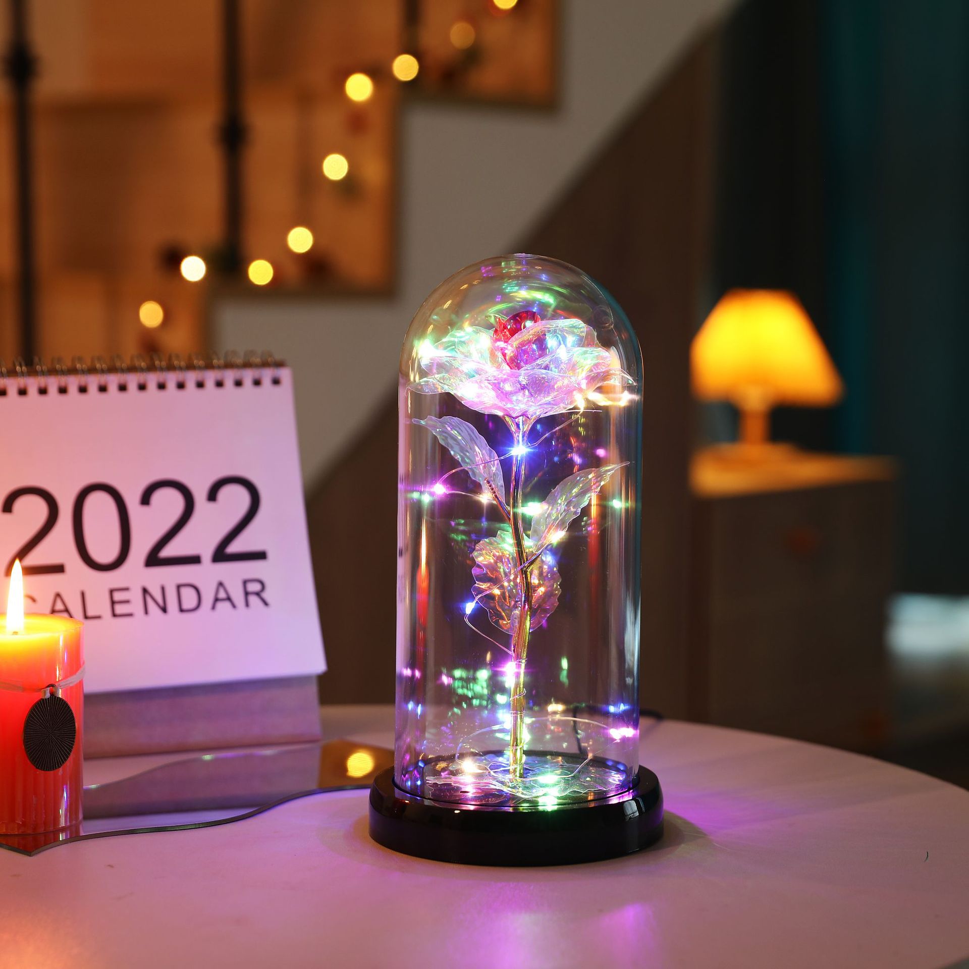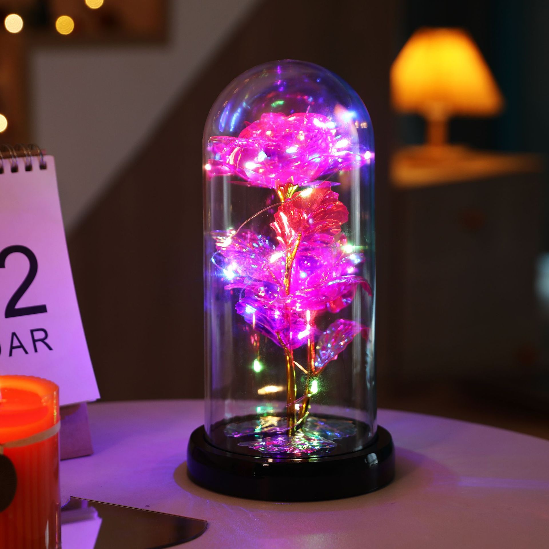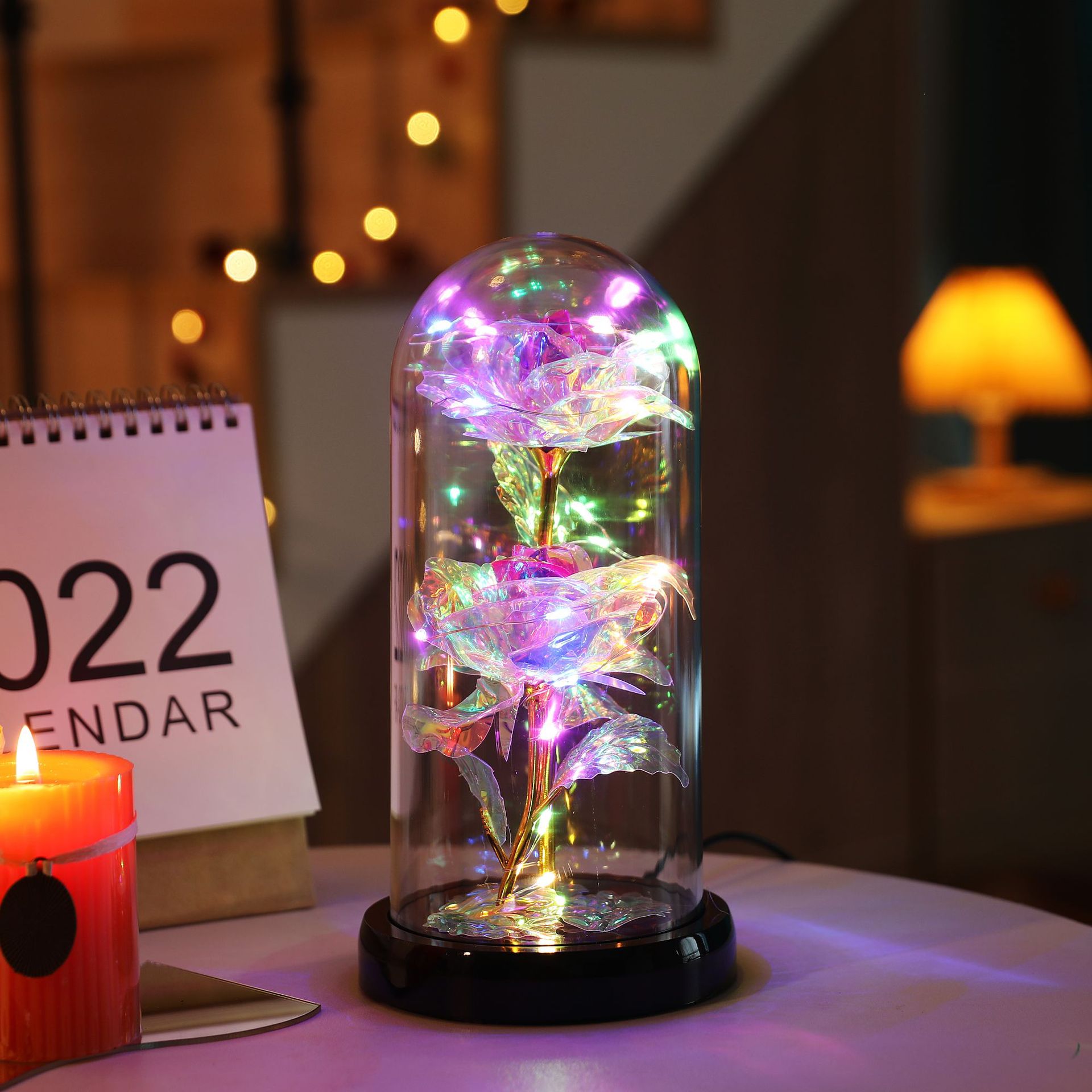 The set includes: Rose cover + base + colored lights + gold foil rose + gold foil leaves + data cable.