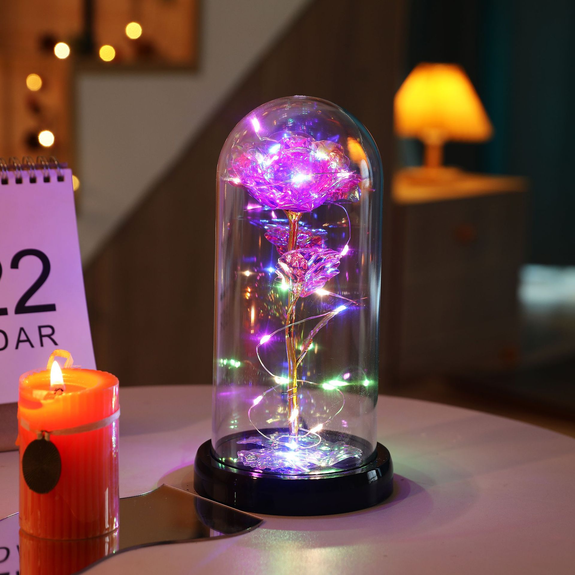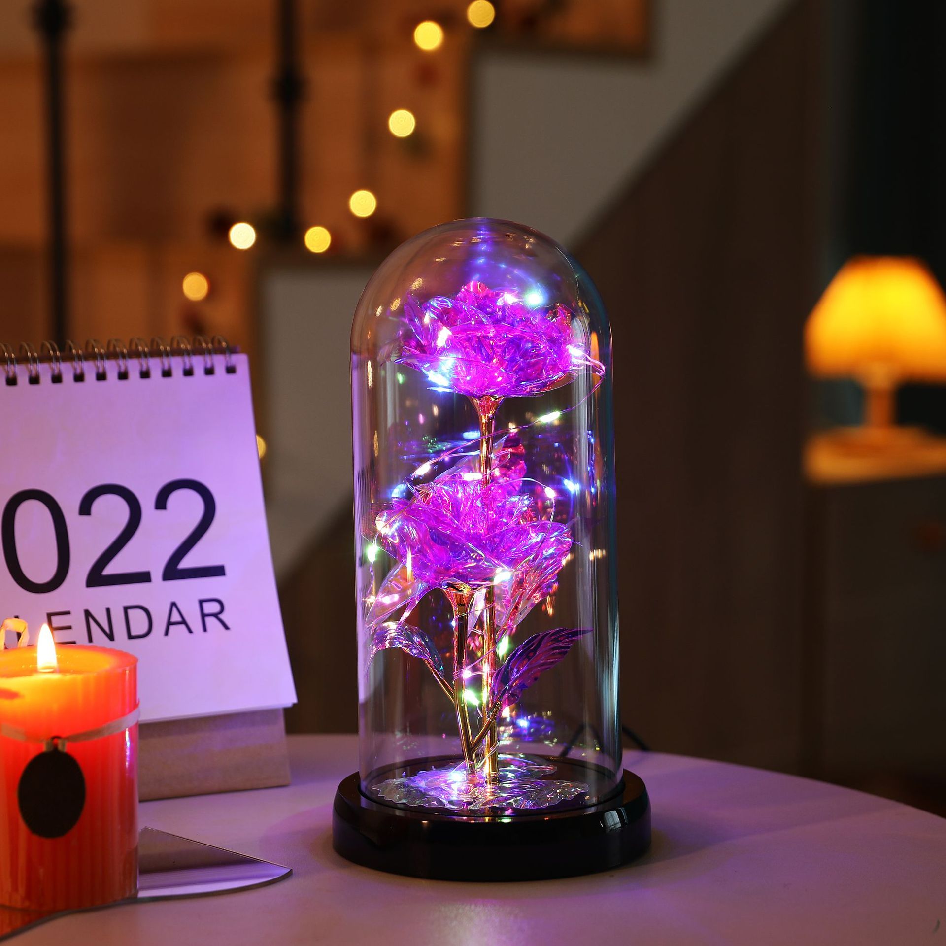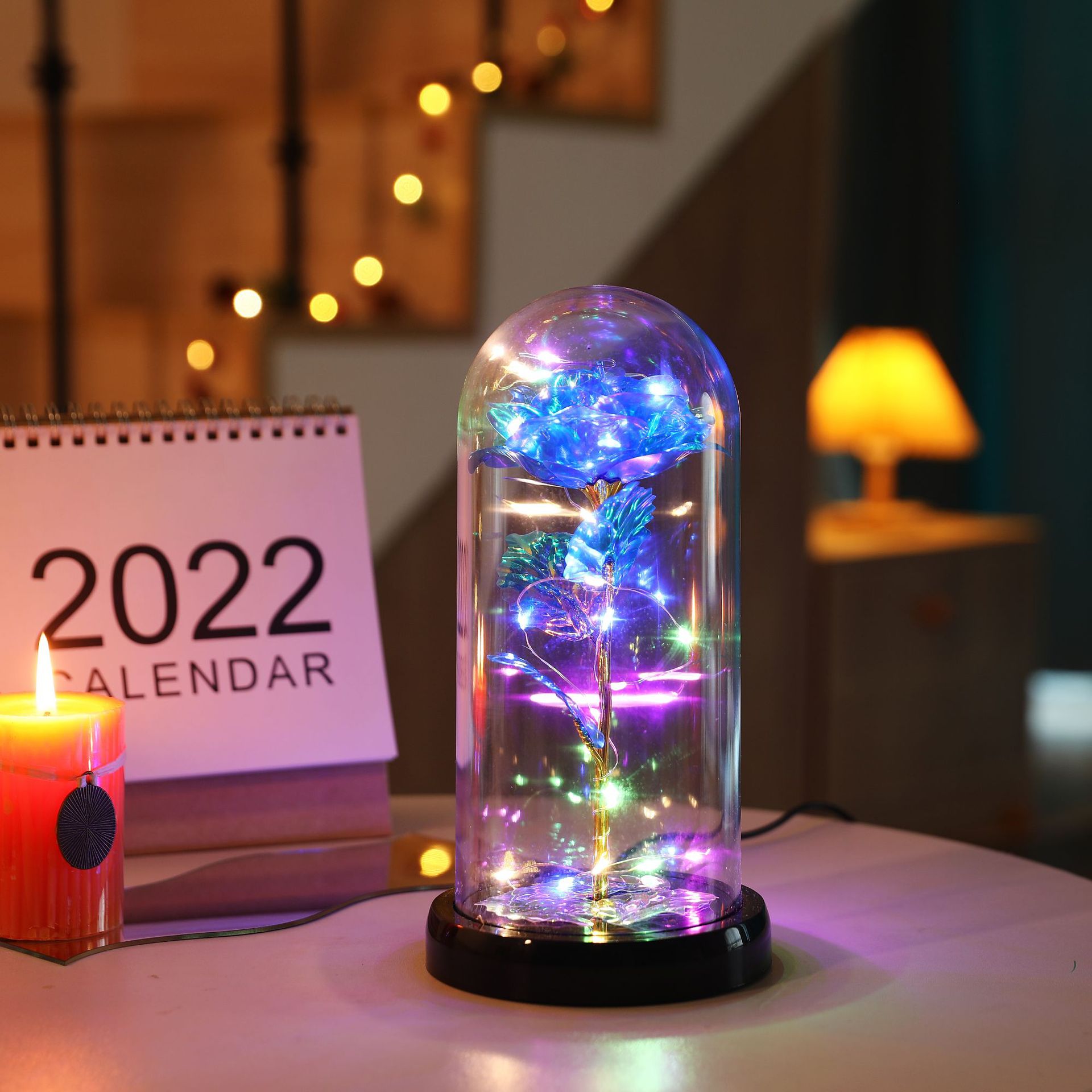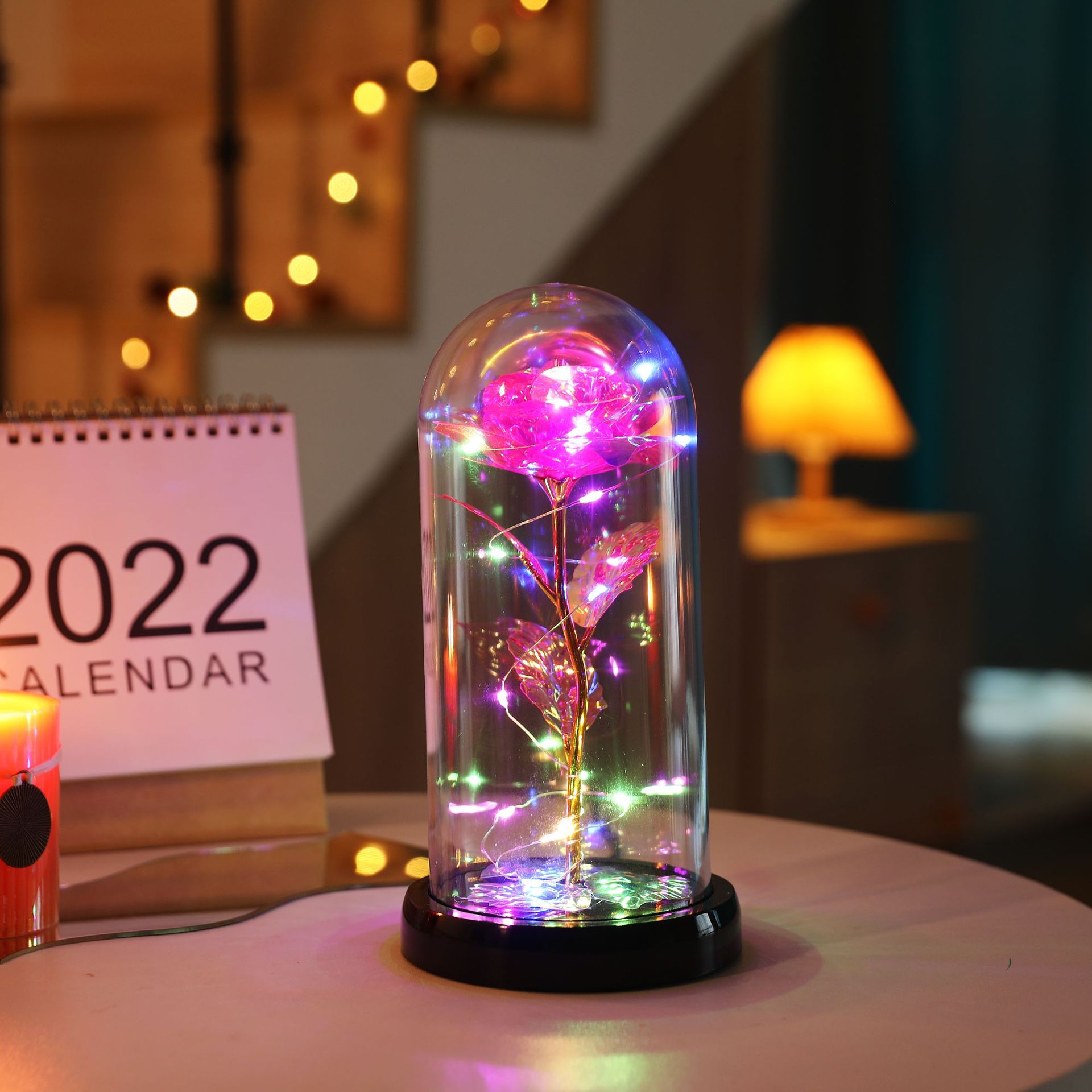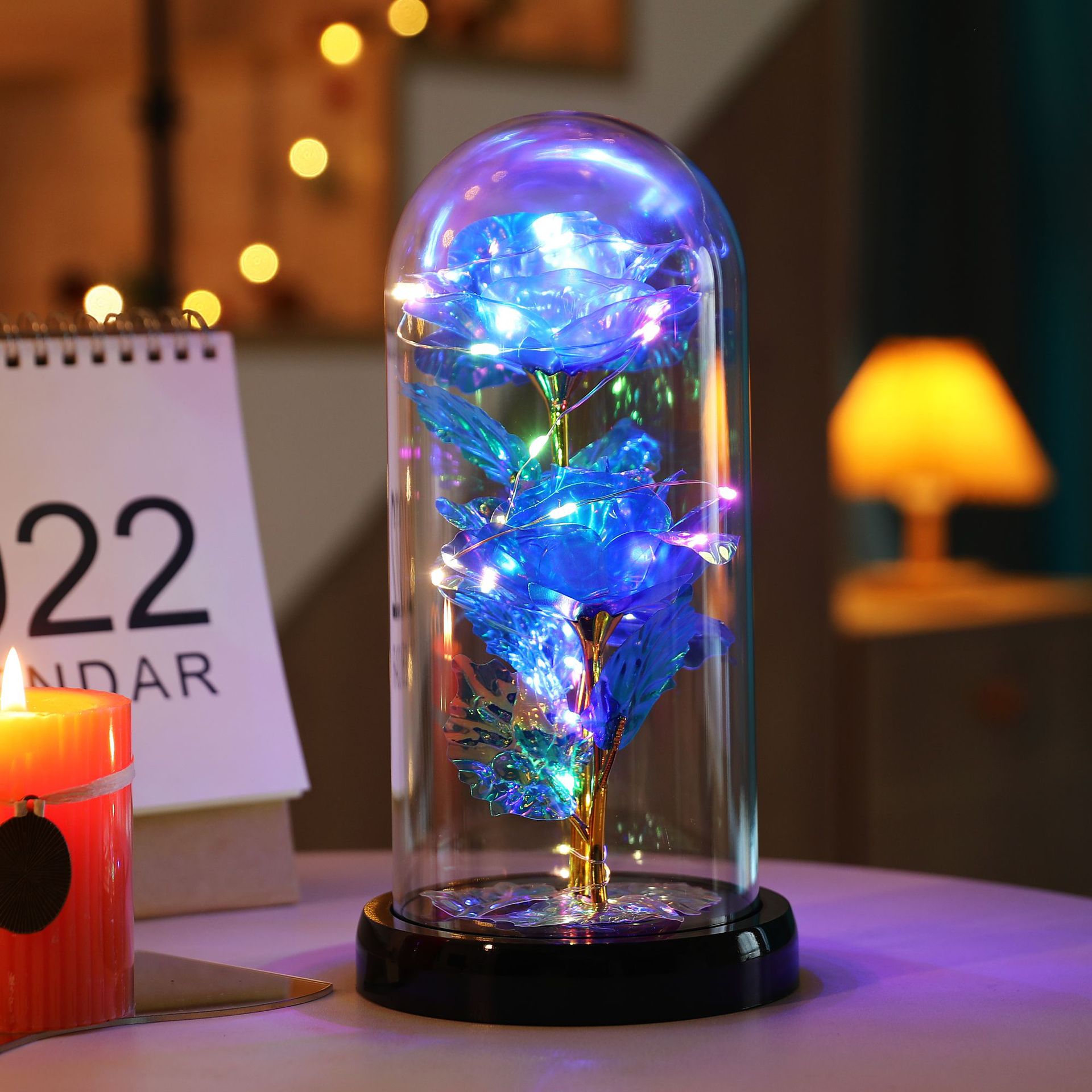 The set includes: Rose cover + base + colored lights + gold foil rose + gold foil leaves + data cable.