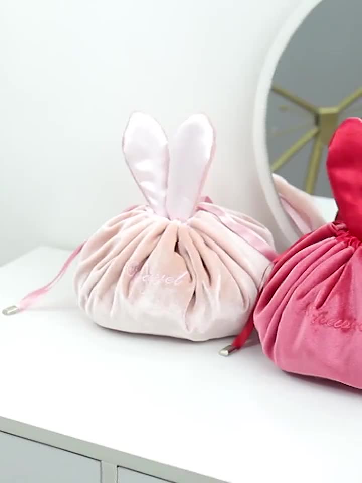 Korean Style Lazy Cosmetic Bag Hand Carrying Rabbit Ears Velvet Cosmetics Storage Bag Travel Portable Drawstring Wash Bag 中文版