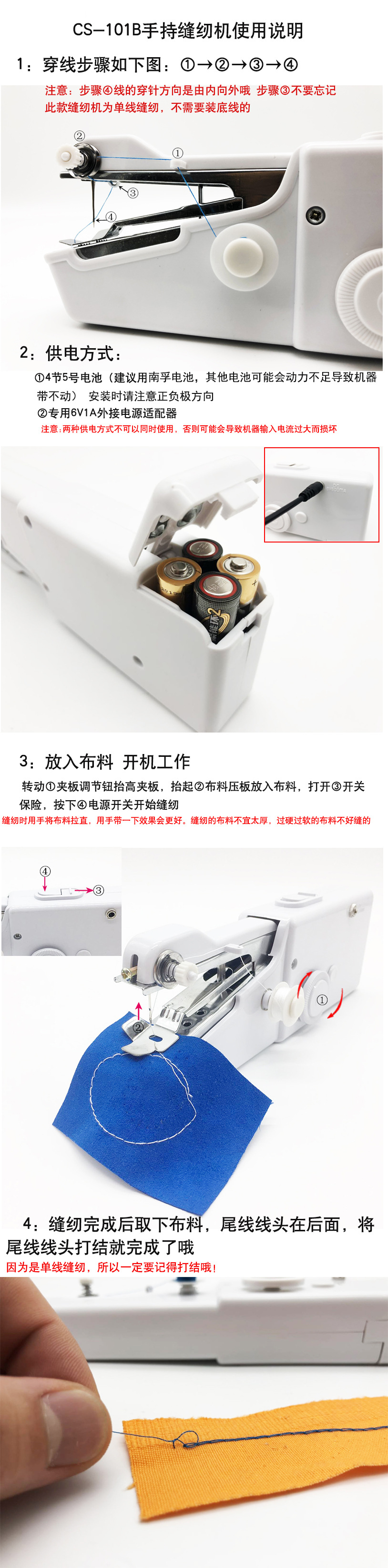 6. Knot Tying: If the single-thread sewing machine needs to be tied, the method of knot tying is on the upper right corner of page 3 of the instruction manual.